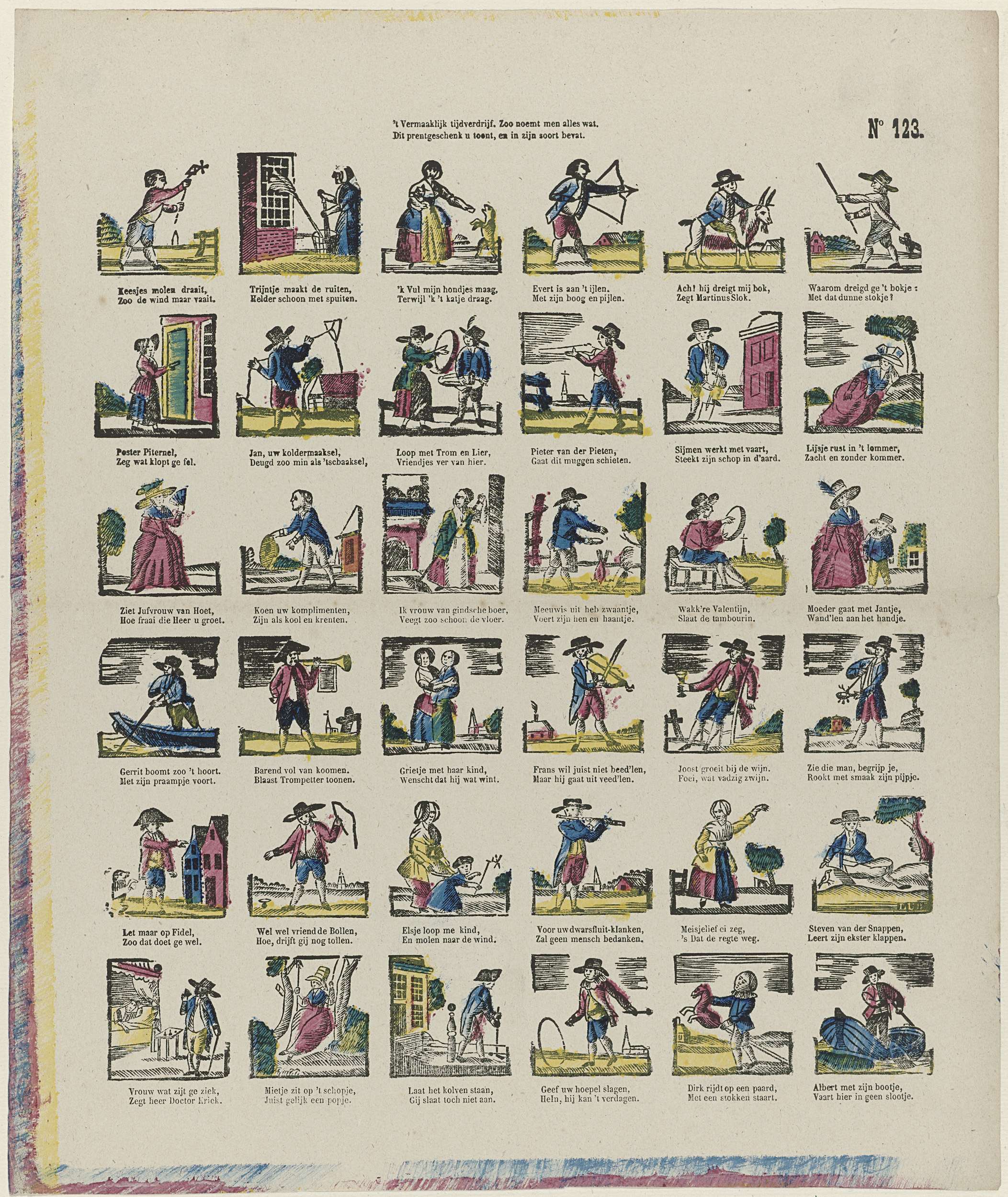 Blad met 36 voorstellingen van spelen en bezigheden voor kinderen en volwassenen. Onder elke afbeelding een tweeregelig vers. Genummerd rechtsboven: No 123.