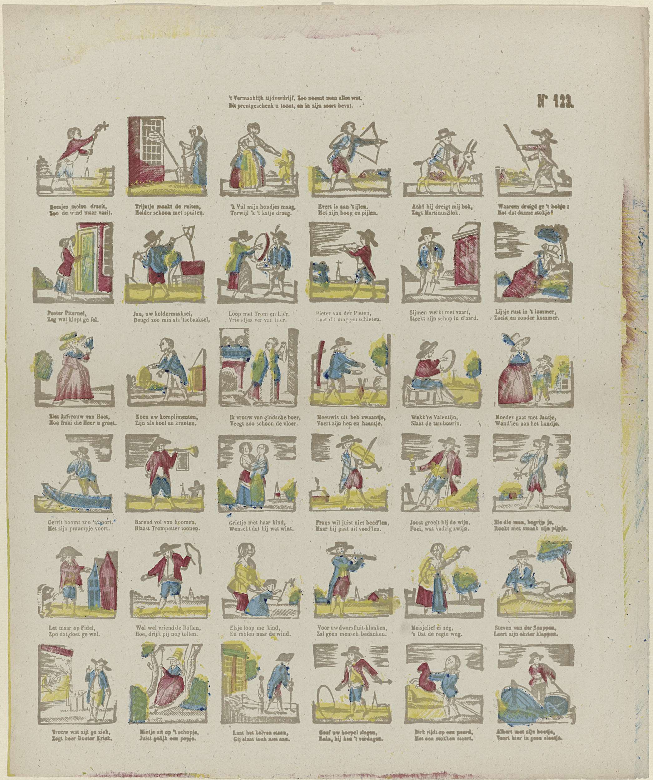 Blad met 36 voorstellingen van spelen en bezigheden voor kinderen en volwassenen. Onder elke afbeelding een tweeregelig vers. Genummerd rechtsboven: No 123.