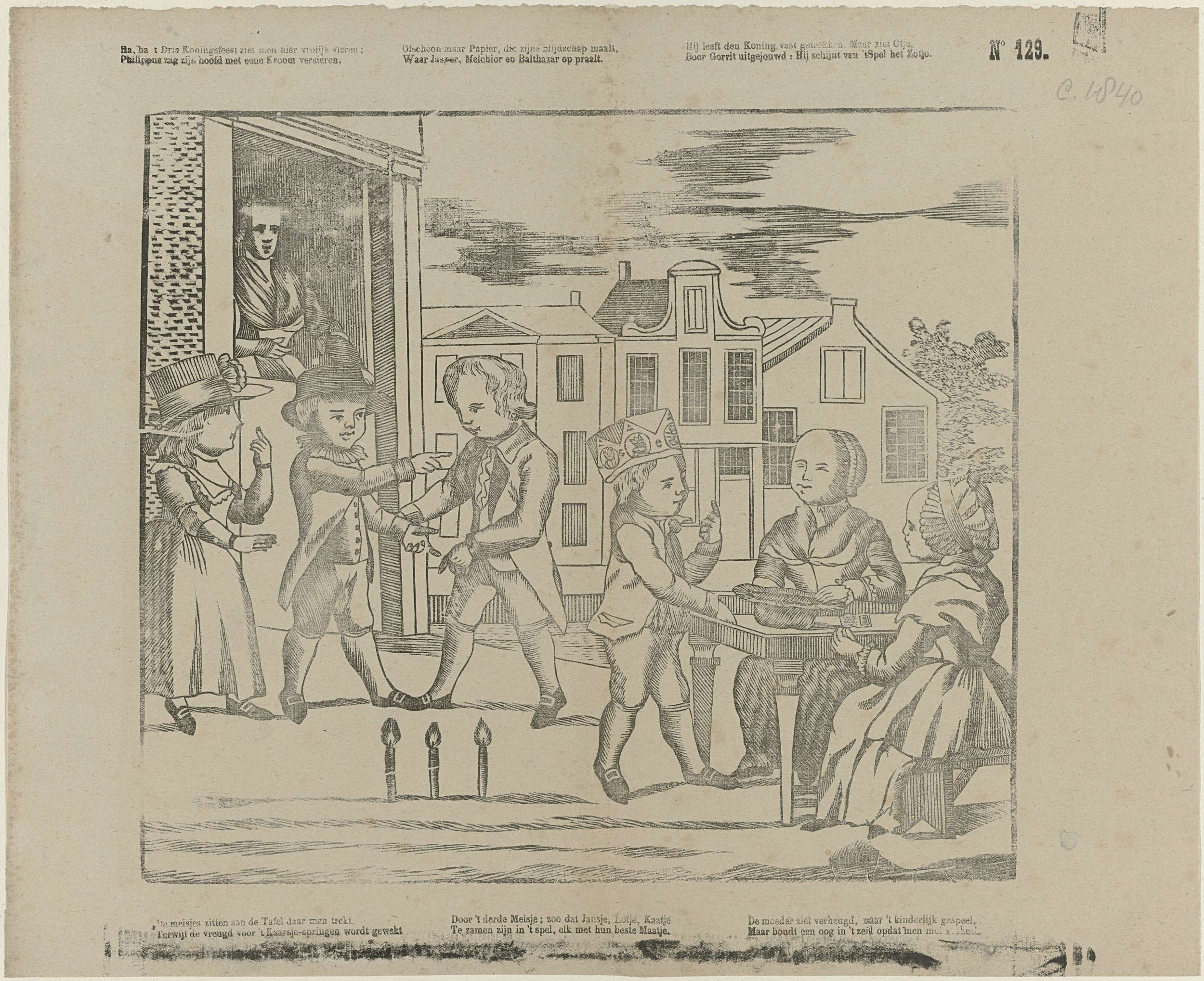 Blad met een grote voorstelling van zes kinderen die het spel koning-trekken spelen op het Driekoningenfeest. Moeder kijkt vanaf een afstandje toe. Boven en onder de afbeelding versregels. Genummerd rechtsboven: No 129.