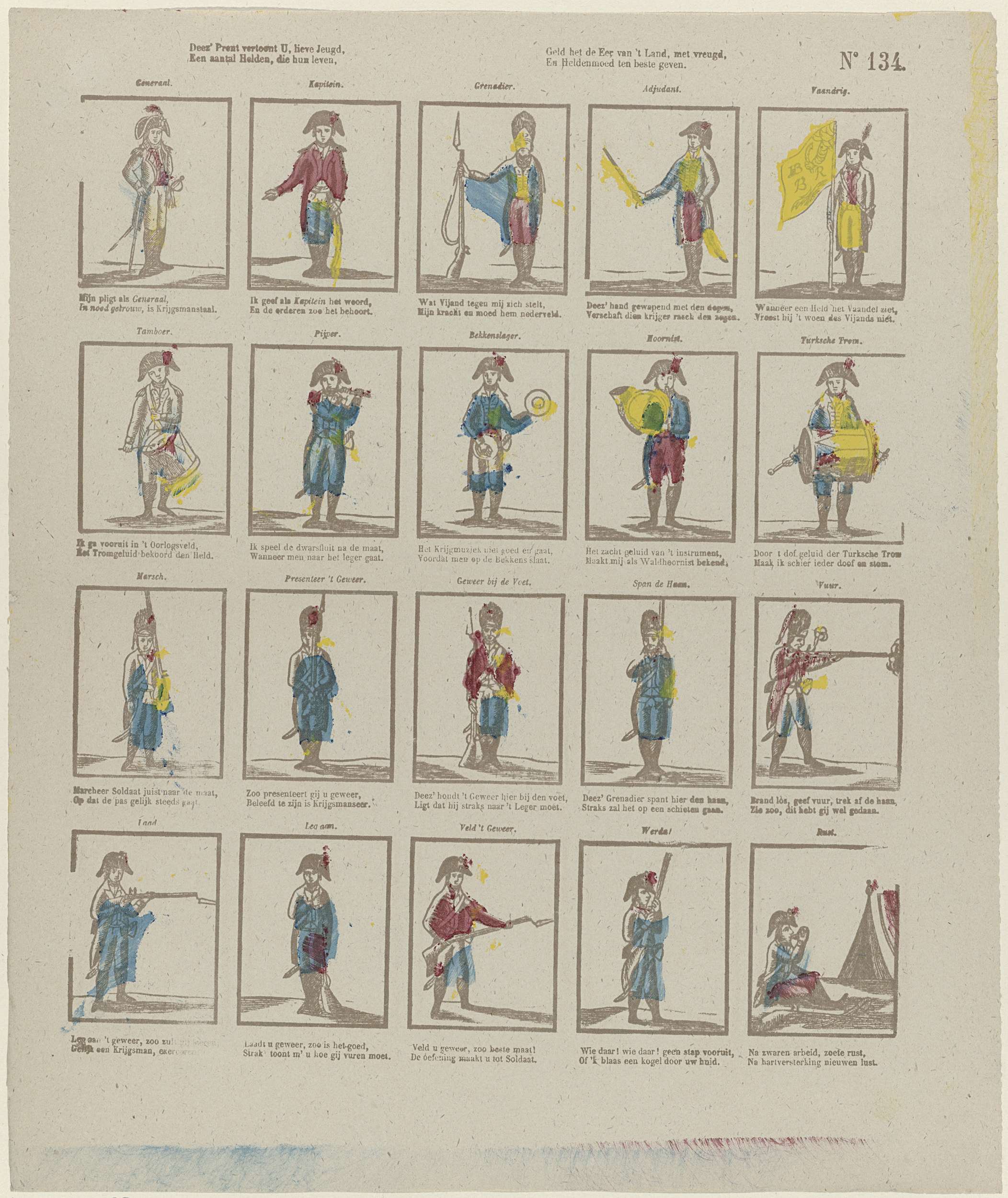 Blad met 20 voorstellingen van militairen. Onder elke afbeelding een tweeregelig vers, boven elke afbeelding een titel. Genummerd rechtsboven: No 134.