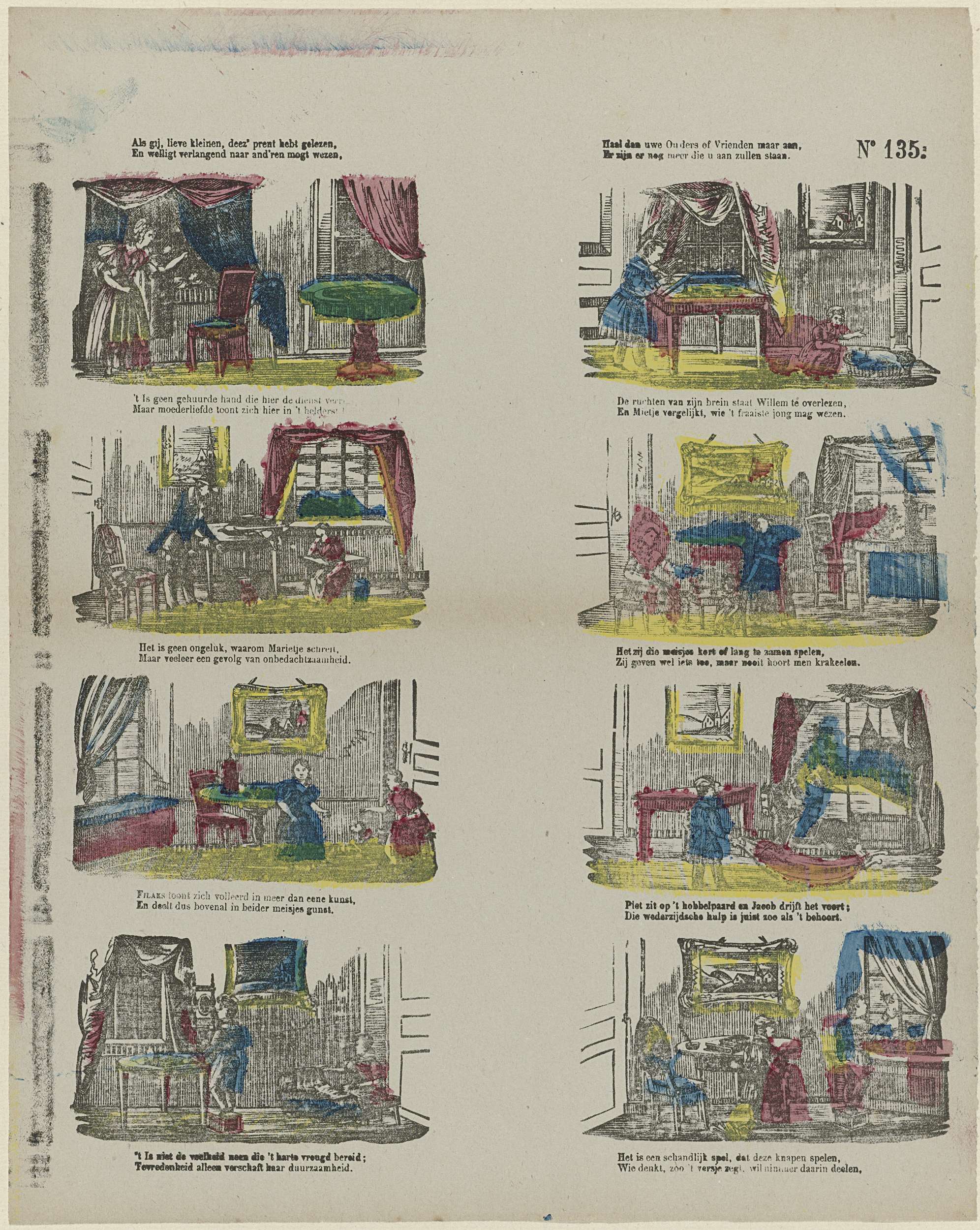 Blad met 8 voorstellingen van bezigheden voor kinderen, zoals studeren en spelen. Onder elke afbeelding een tweeregelig vers. Genummerd rechtsboven: No 135.