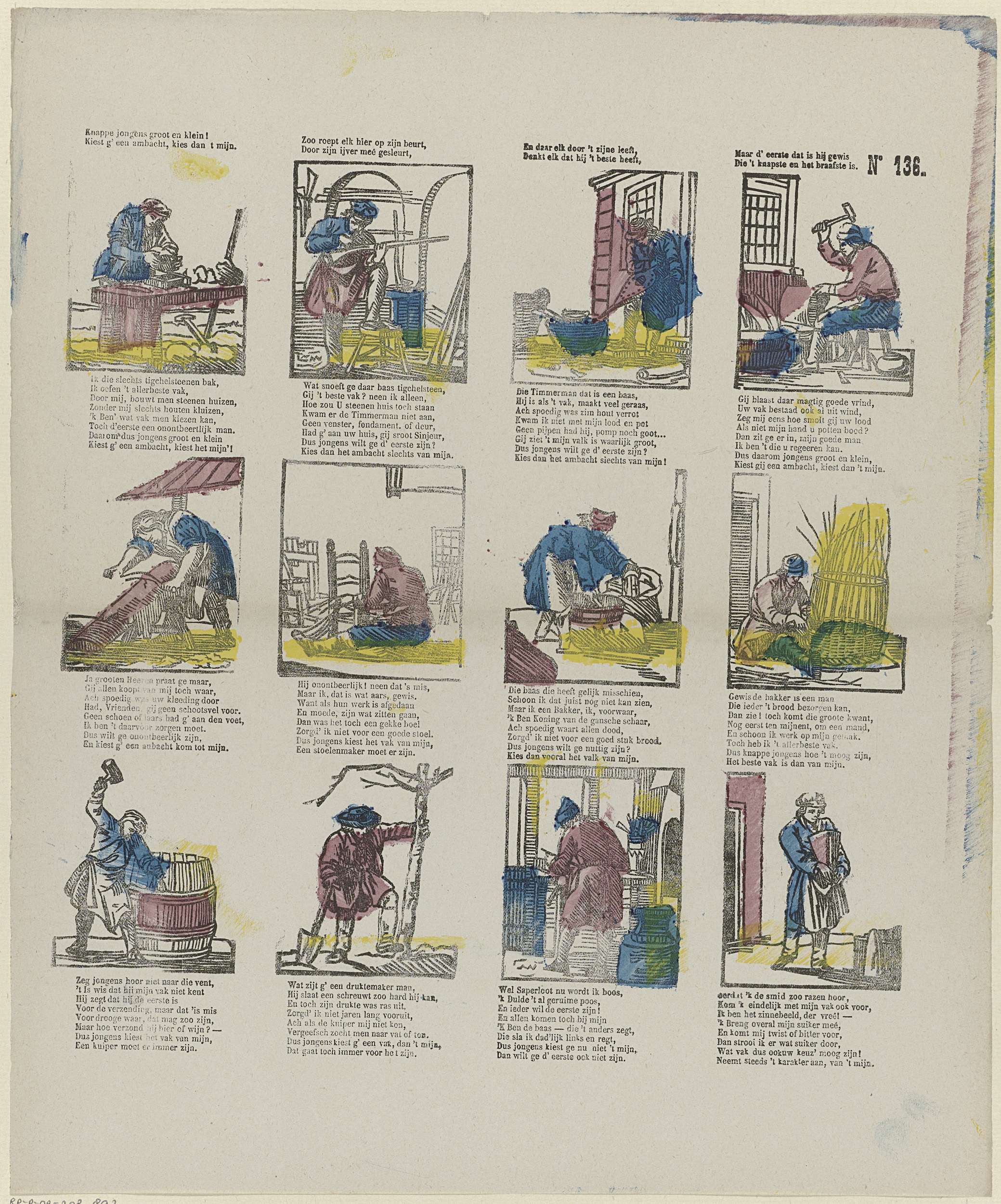 Blad met 12 voorstellingen van ambachtslieden, zoals timmerman, mandenvlechter en kuiper. Onder elke afbeelding een achtregelig vers. Genummerd rechtsboven: No 136.