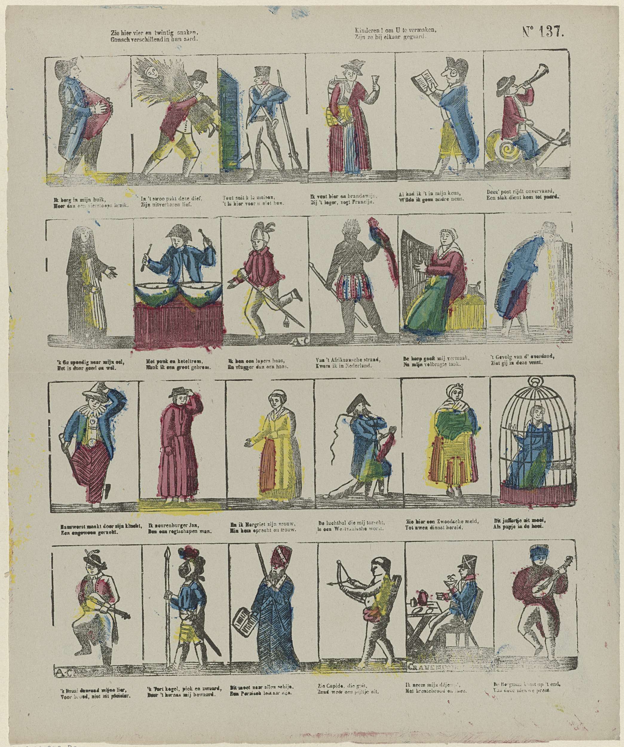 Blad met 24 voorstellingen van verschillende figuren, waaronder karikaturale figuren en theaterpersonages. Onder elke afbeelding een tweeregelig vers. Genummerd rechtsboven: No 137.
