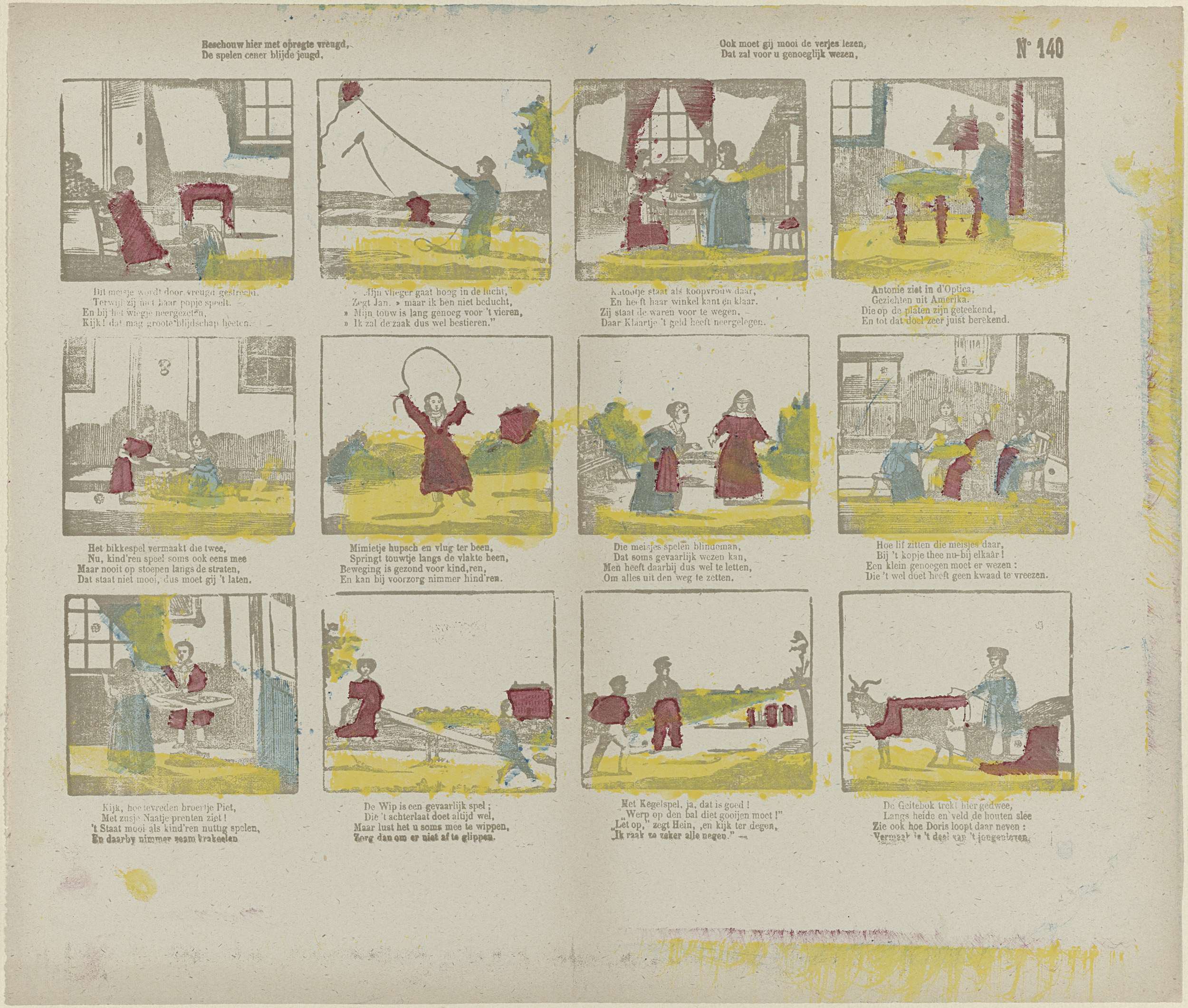 Blad met 12 voorstellingen van kinderspelen en bezigheden, zoals vliegeren, touwtjespringen en kegelen. Onder elke afbeelding een vierregelig vers. Genummerd rechtsboven: No 140.