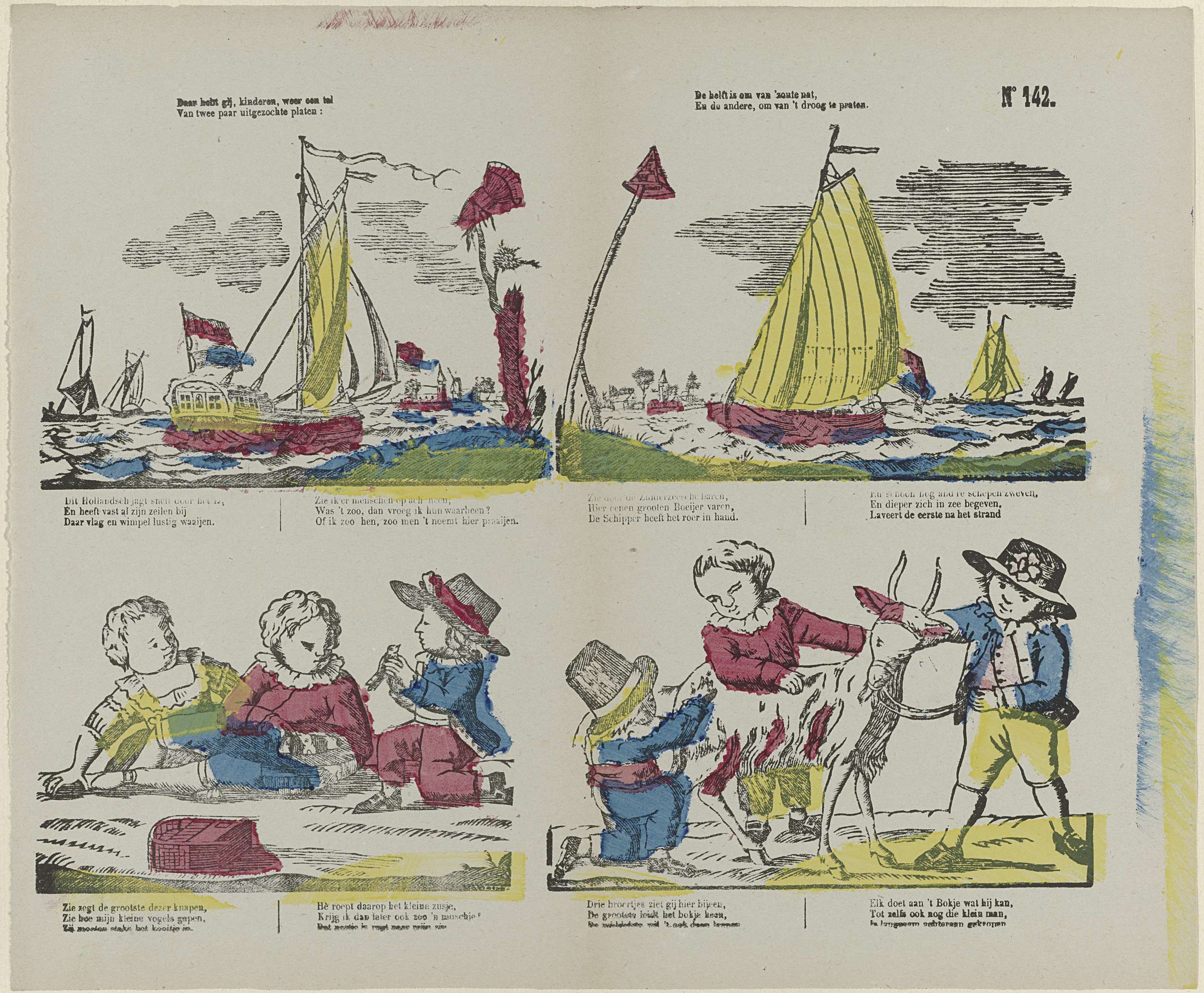 Blad met 4 voorstellingen. Boven twee voorstellingen van schepen, onder twee voorstellingen van kinderen die met dieren spelen. Onder elke afbeelding een zesregelig vers in twee kolommen. Genummerd rechtsboven: No 142.