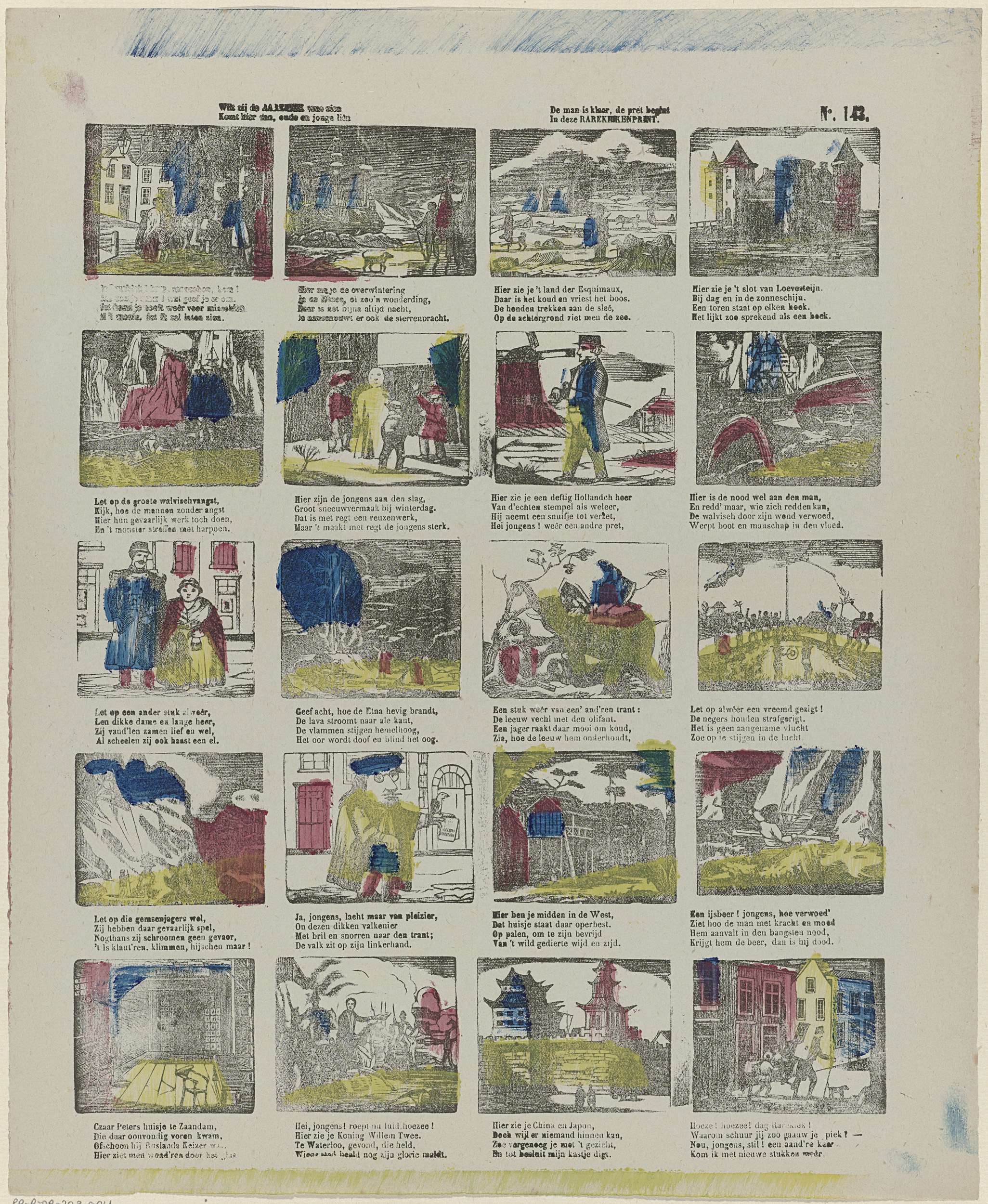 Blad met 20 voorstellingen van verschillende aard, waaronder voorstellingen van de Noordpool, kinderen die een sneeuwpop maken en een valkenier. Onder elke afbeelding een vierregelig vers. Genummerd rechtsboven: No. 143.
