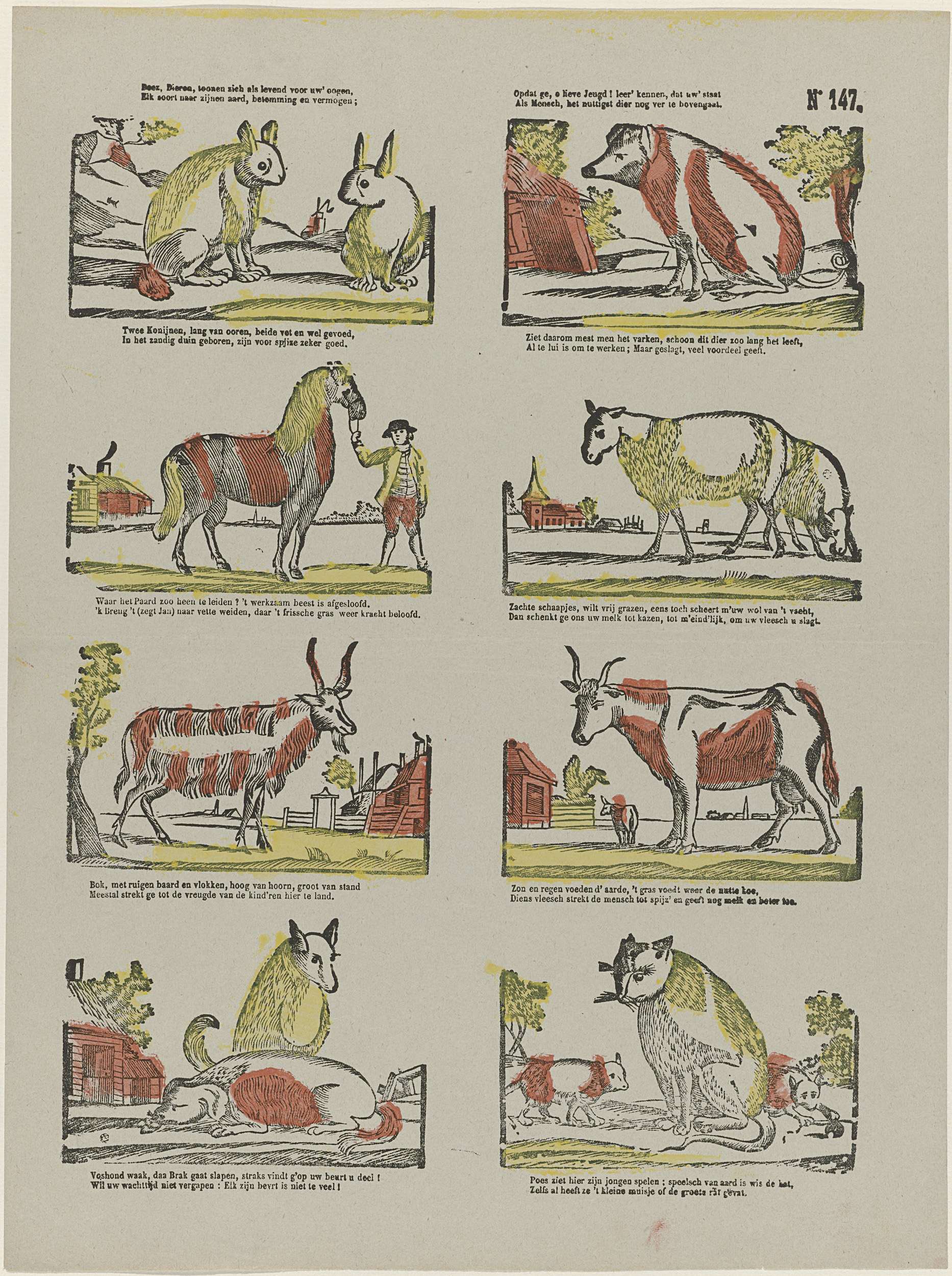 Blad met 8 voorstellingen van dieren, waaronder konijnen, een varken, een paard en honden. Onder elke afbeelding een tweeregelig vers. Genummerd rechtsboven: No 147.