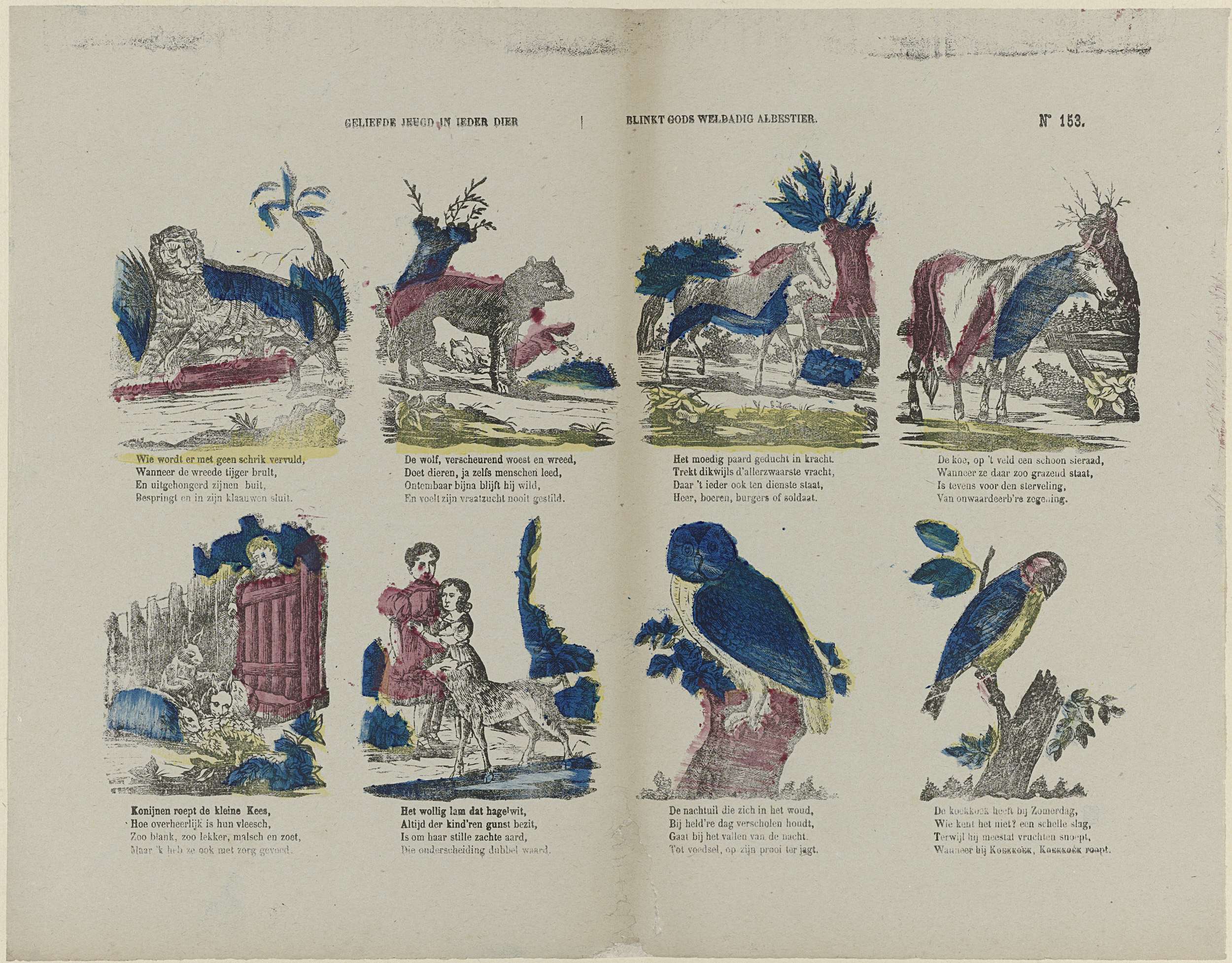 Blad met 8 voorstellingen van dieren, zoals een tijger, een wolf, een paard en een uil. Onder elke voorstelling een vierregelig vers. Genummerd rechtsboven: No 153.