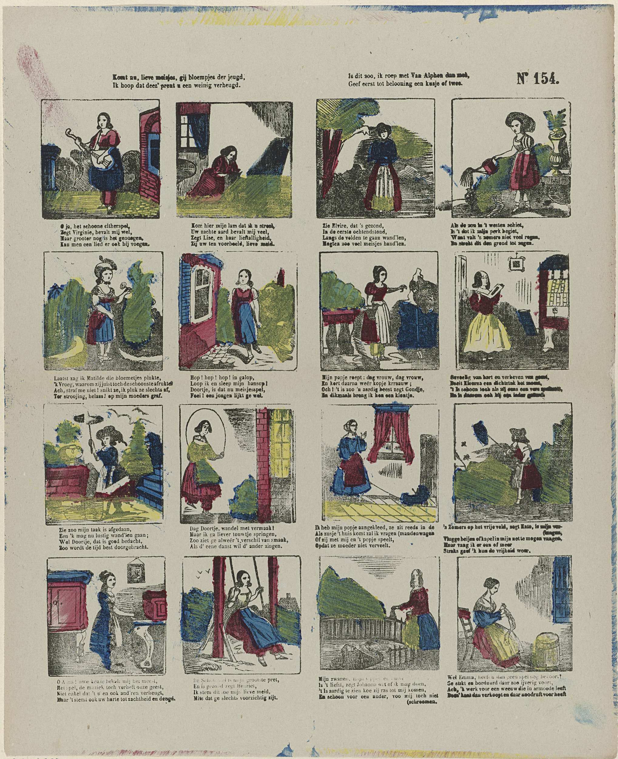 Blad met 16 voorstellingen van spelen en bezigheden voor meiden, zoals wandelen, touwtjespringen en schommelen. Onder elke voorstelling een vierregelig vers. Genummerd rechtsboven: No 154.