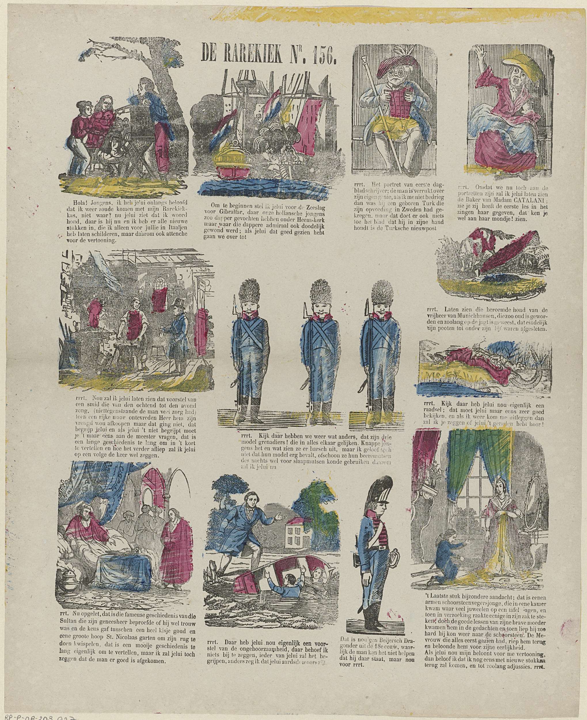 Blad met 12 voorstellingen van verschillende figuren en bezigheden, zoals soldaten, karikaturale figuren en een sultan. Onder elke afbeelding een onderschrift. Genummerd rechtsboven: Nr. 156.
