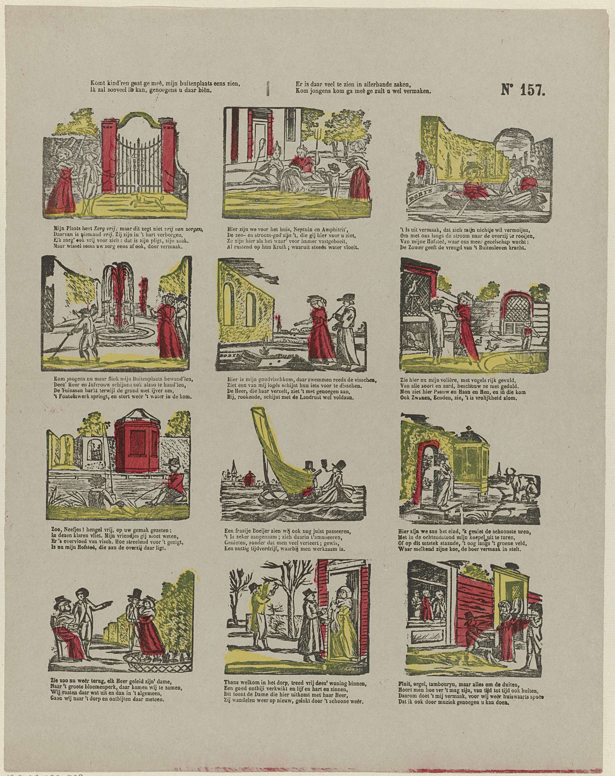 Blad met 12 voorstellingen van mensen in tuinen, parken, bij fonteinen en op het water. Onder elke afbeelding een vierregelig vers. Genummerd rechtsboven: No 157.