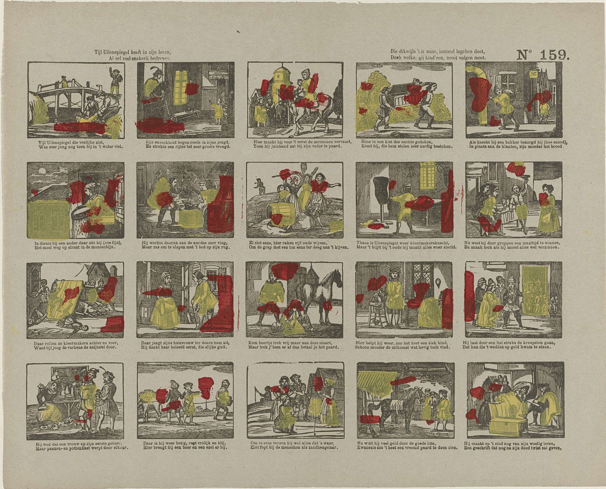 Blad met 20 voorstellingen over het leven van Tijl Uilenspiegel. Onder elke afbeelding een tweeregelig vers. Genummerd rechtsboven: No 159.