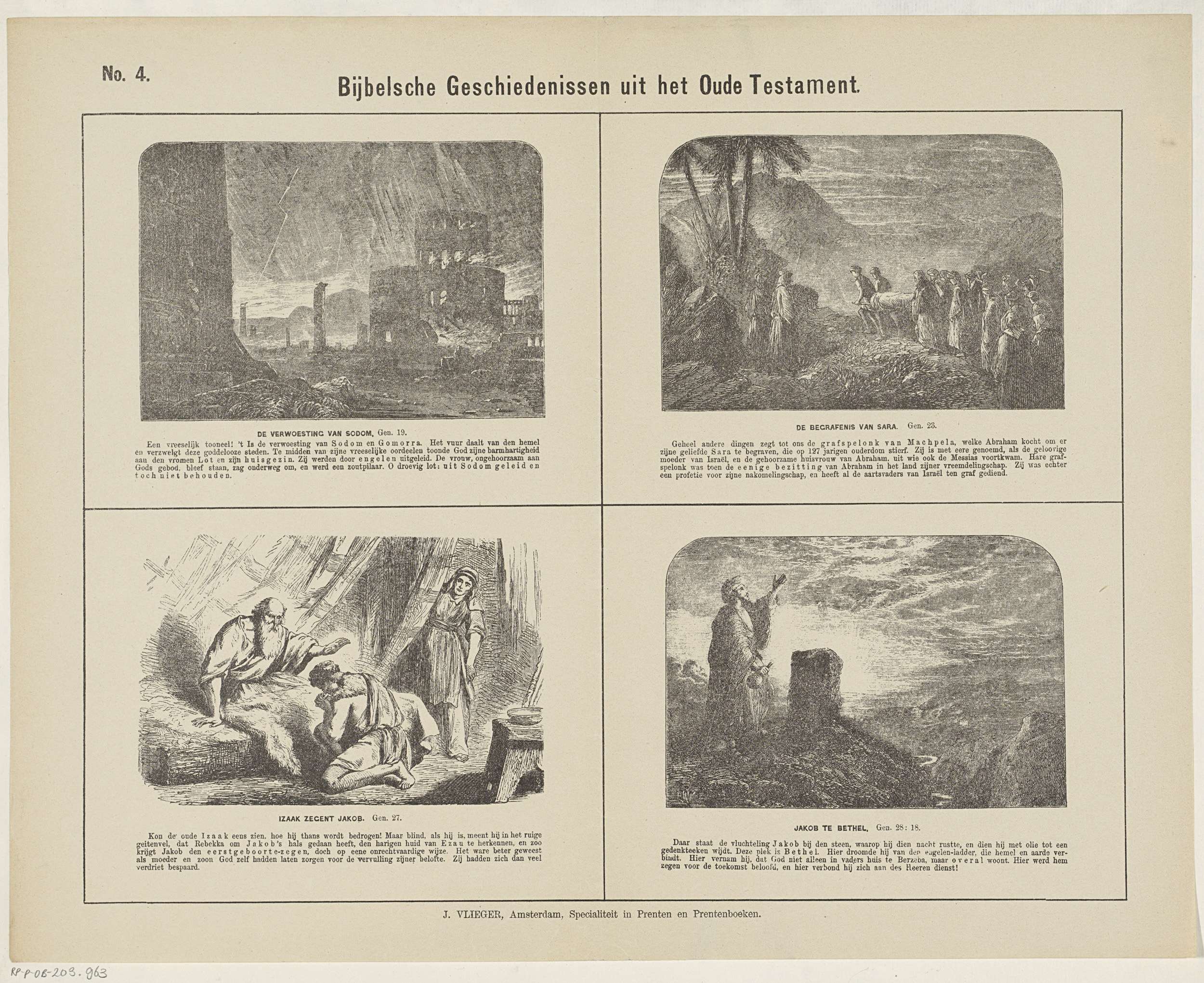 Blad met 4 voorstellingen van verhalen uit het Oude Testament. De verwoesting van Sodom, De begrafenis van Sara, Isaak zegent Jakob en Jakob te Betel. Onder elke afbeelding de bijbehorende Bijbeltekst. Genummerd linksboven: No. 4.