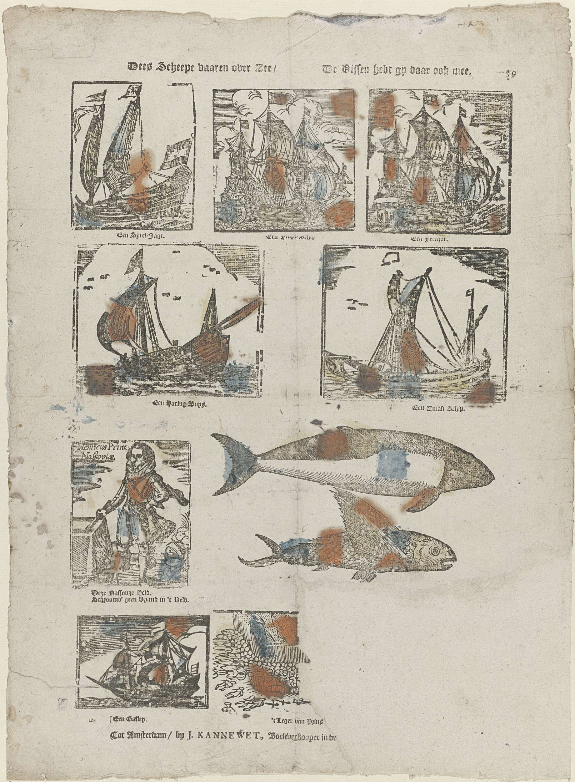 Blad met 10 voorstellingen van verschillende aard, waaronder voorstellingen van schepen, een gezagvoerder ter zee, vissen en een leger. Onder elke afbeelding een onderschrift. Genummerd rechtsboven: 99.