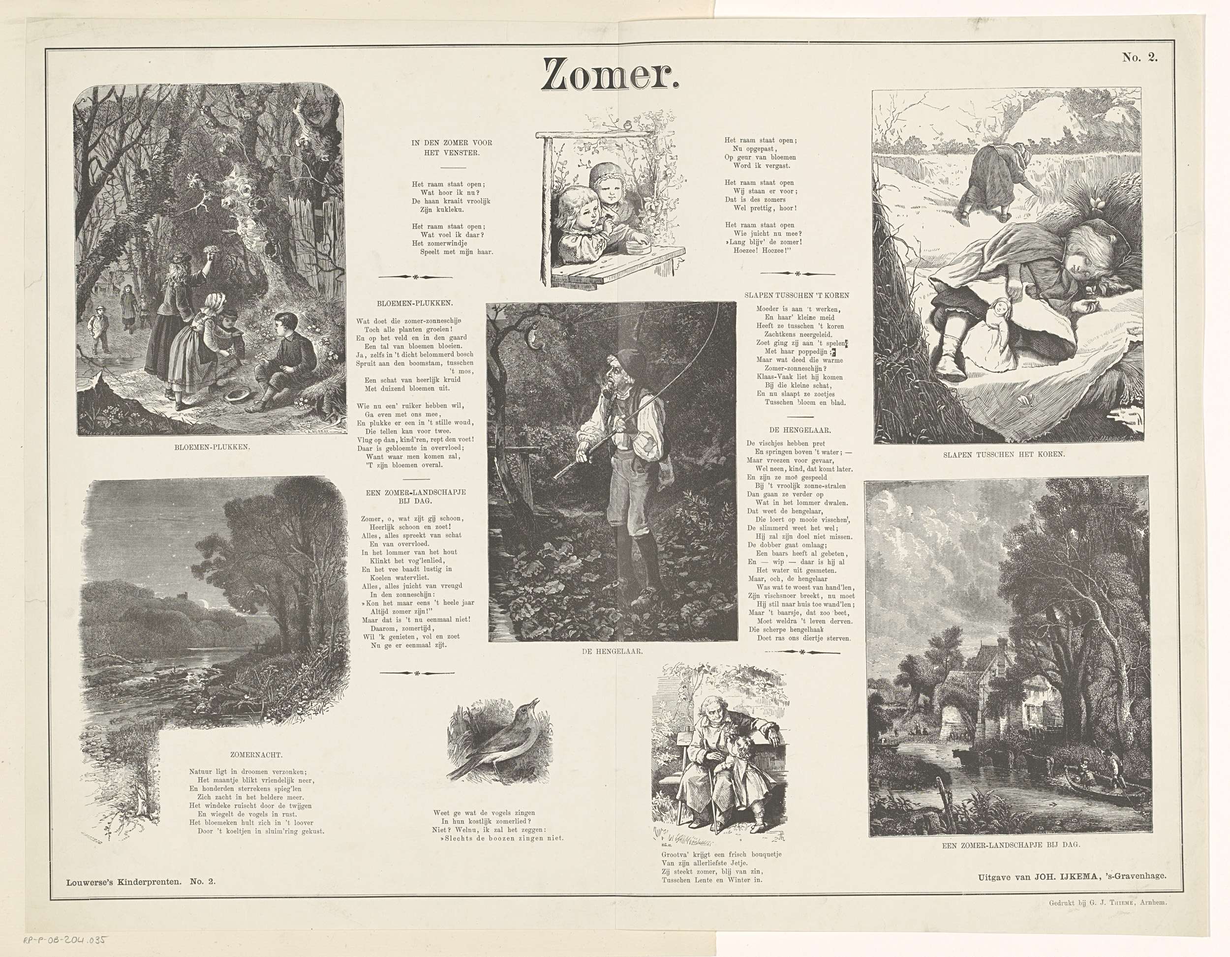 Blad met 8 voorstellingen van zomertaferelen, zoals kinderen die bloemen plukken, een landschap tijdens een heldere zomernacht en een meisje slapend tussen het koren. Tussen de afbeeldingen versjes in boekdruk. Genummerd rechtsboven en linksonder: No. 2.