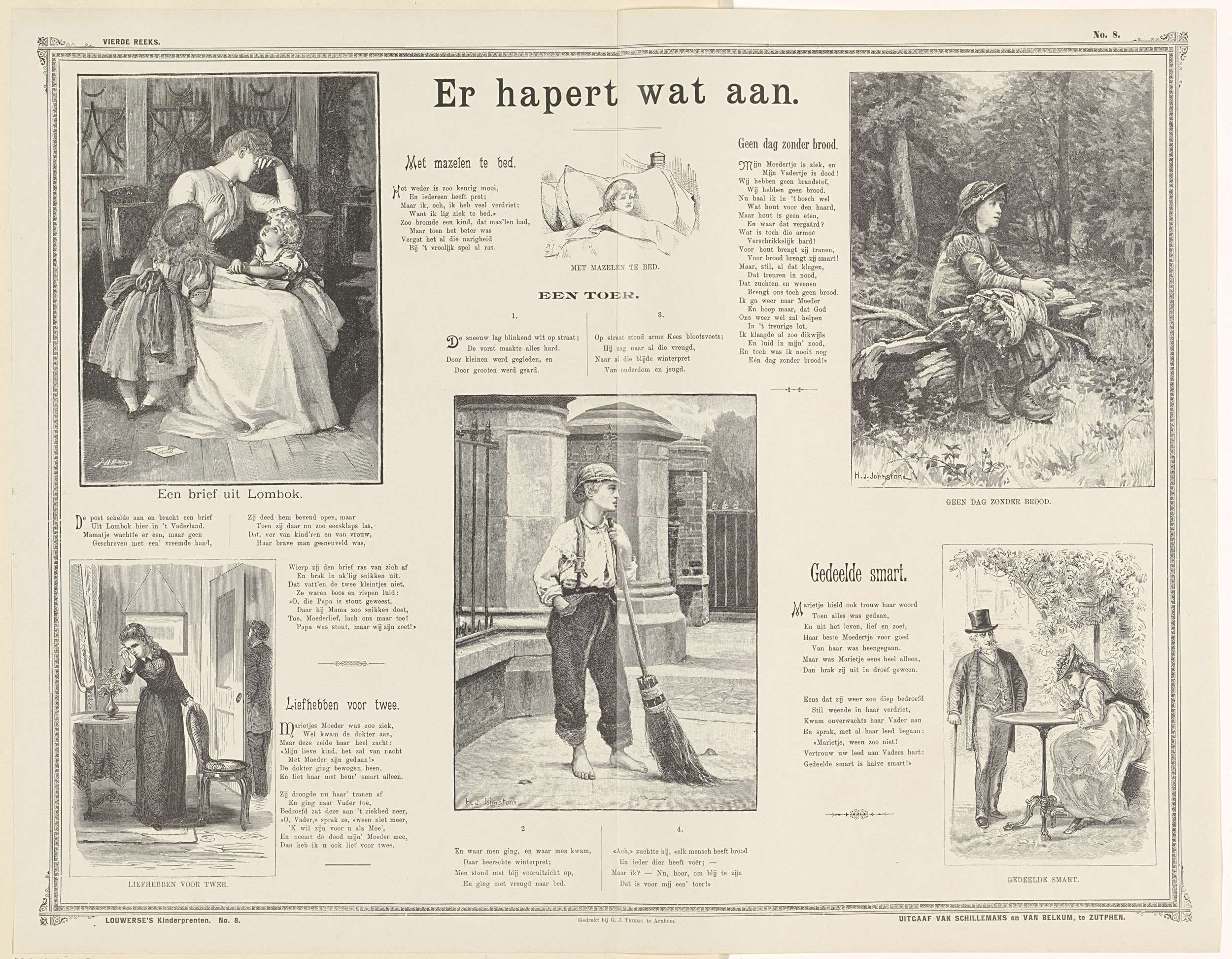 Blad met 6 voorstellingen van treurende, zieke en peinzende mensen. Tussen de afbeeldingen versjes in boekdruk. Genummerd rechtsboven en linksonder: No. 8.