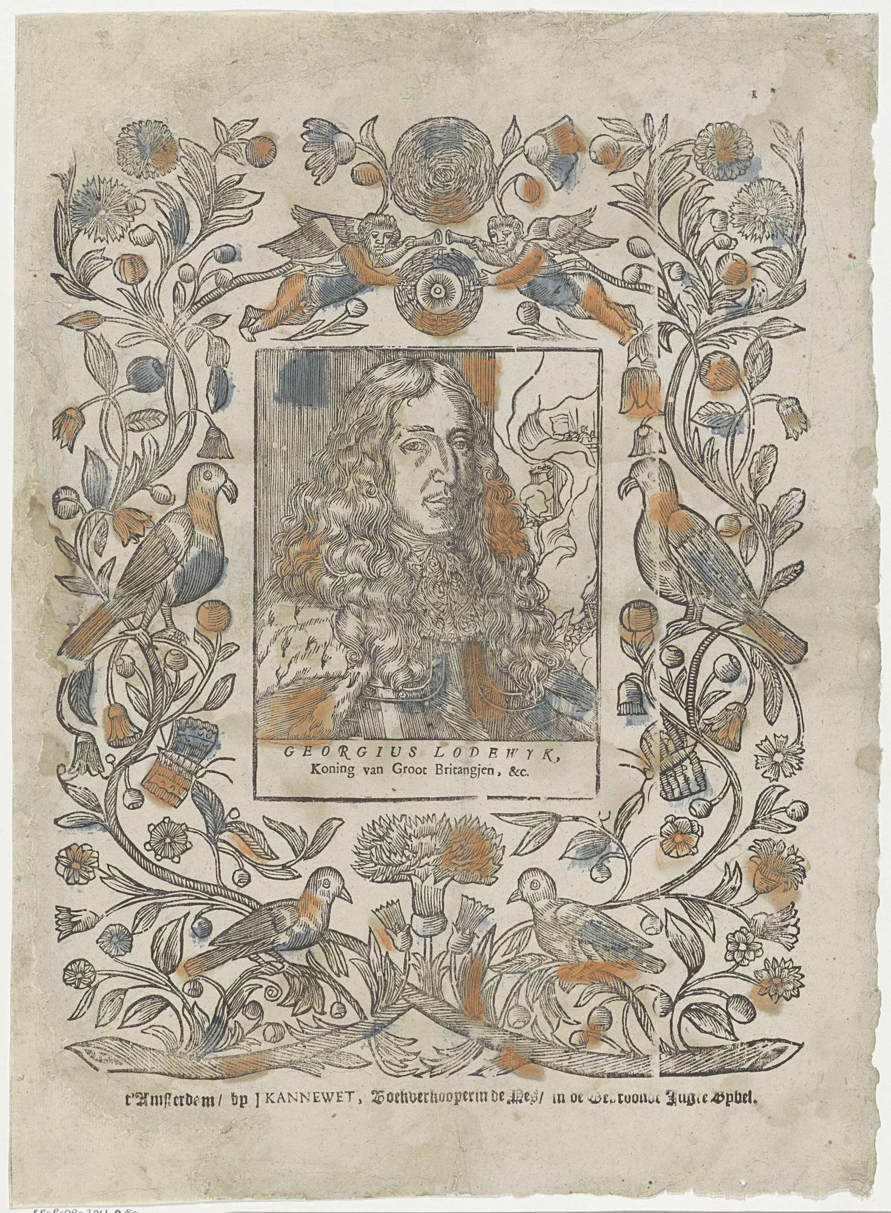 Portret van George I, gevat in een sierlijst met ranken, bloemen, vogels en putti. Genummerd rechtsboven: 1*.
