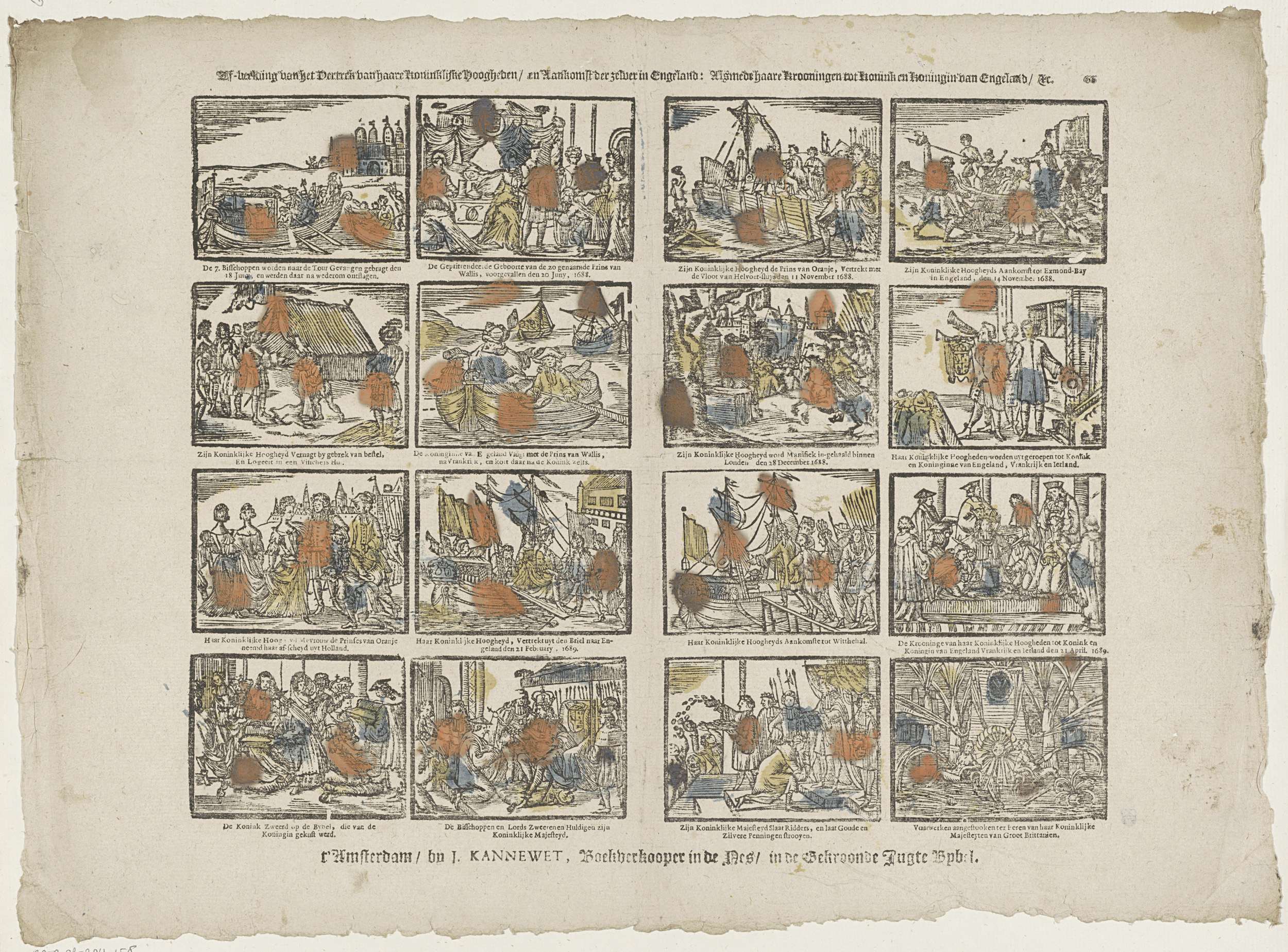 Blad met 16 voorstellingen over de aankomst en het leven van Willem III en Maria II Stuart in Engeland. Onder elke voorstelling een tweeregelig vers. Genummerd rechtsboven: 66.