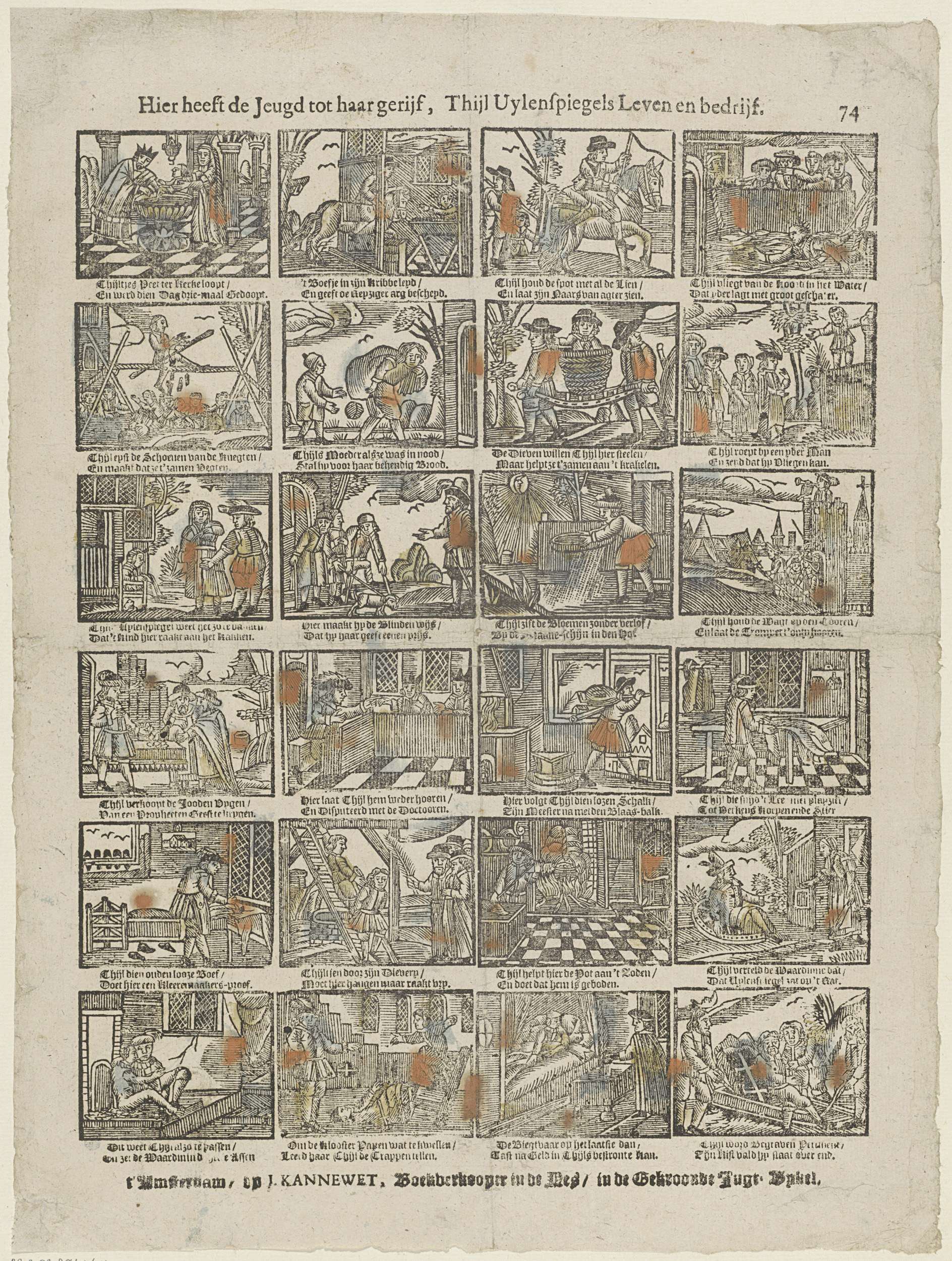 Blad 24 voorstellingen over het leven van Tijl Uilenspiegel. Onder elke afbeelding een tweeregelig vers. Genummerd rechtsboven: 74.