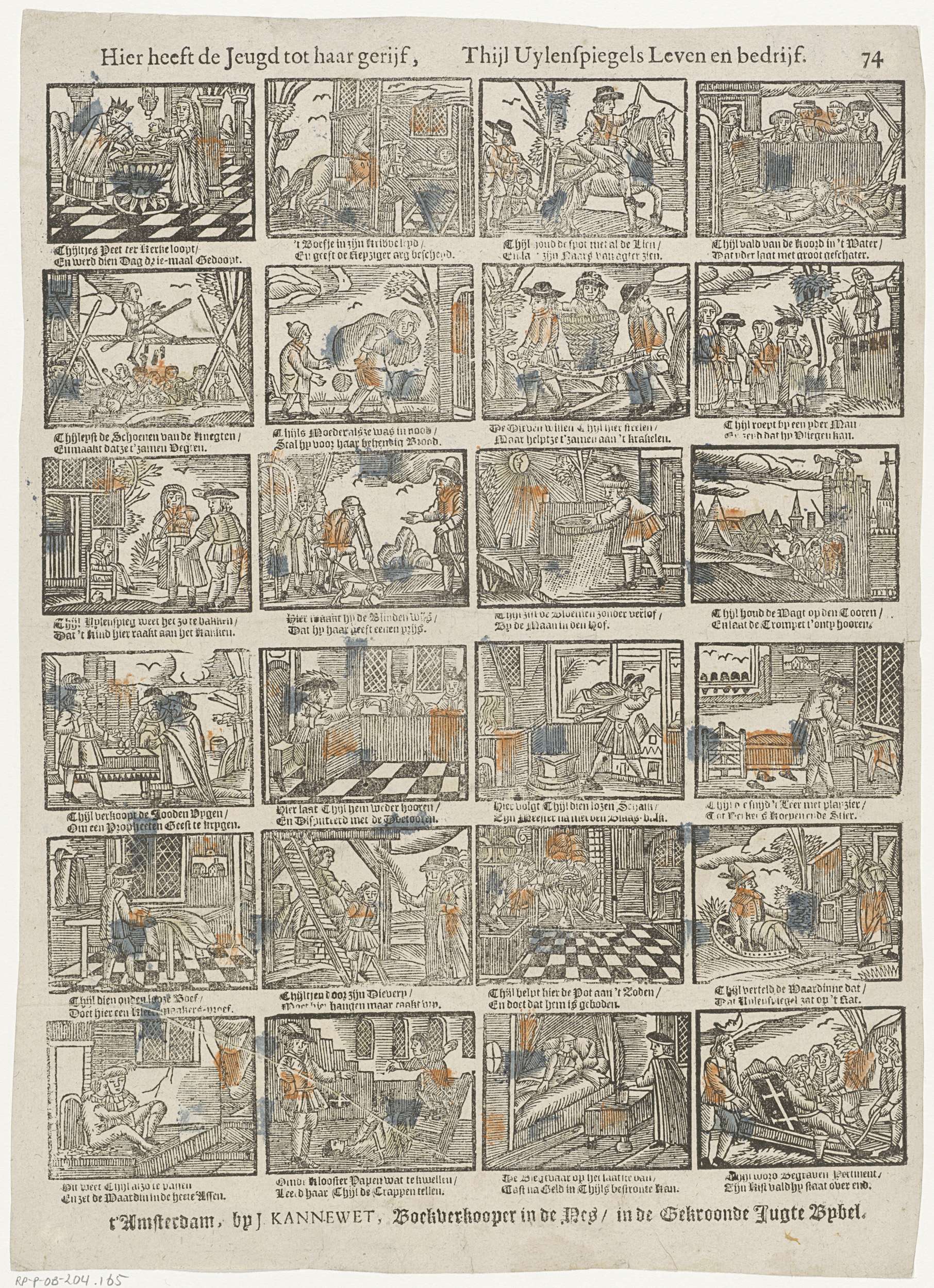 Blad 24 voorstellingen over het leven van Tijl Uilenspiegel. Onder elke afbeelding een tweeregelig vers. Genummerd rechtsboven: 74.