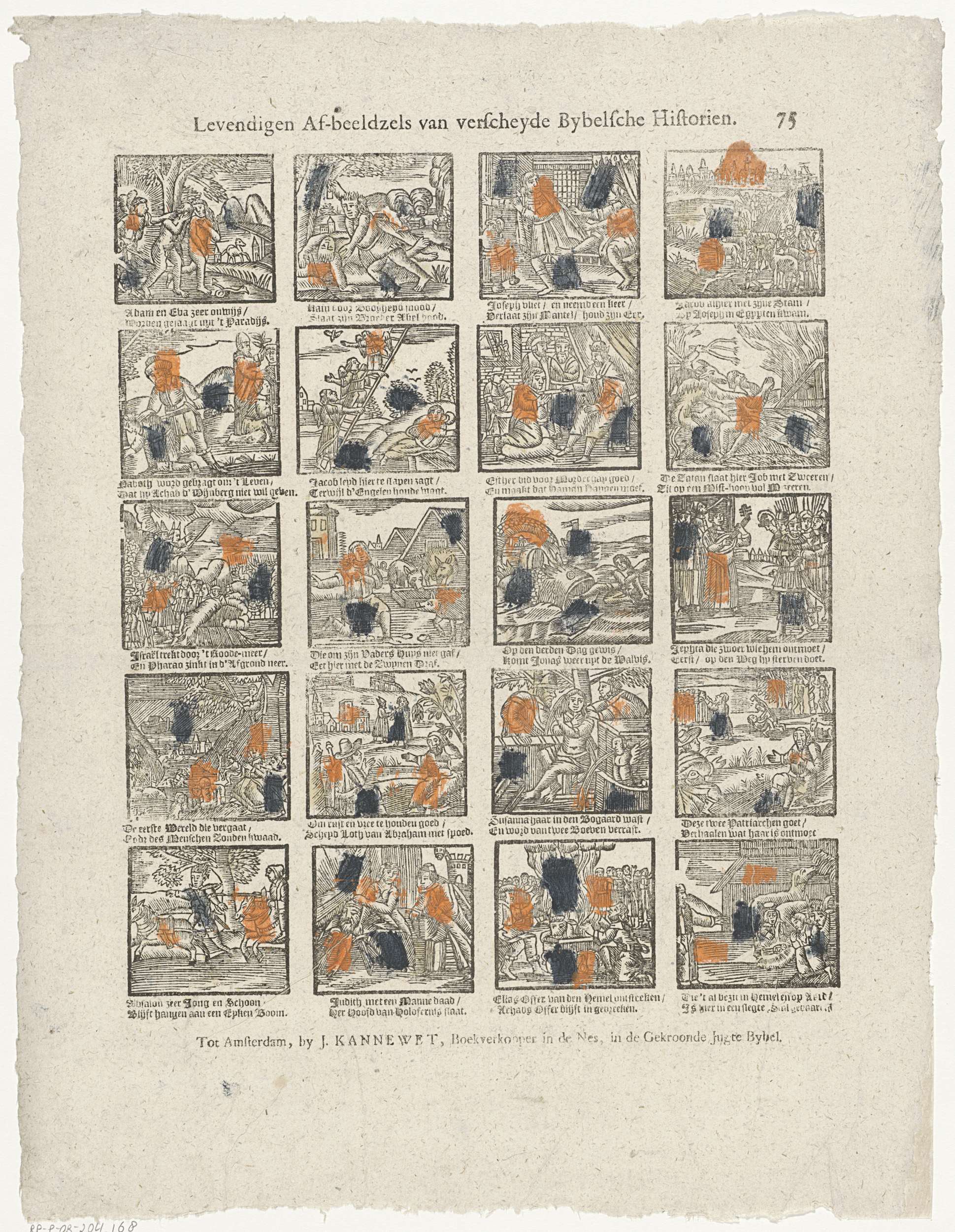 Blad met 20 voorstellingen van verhalen uit het Oude Testament, waaronder Adam en Eva die worden verdreven uit het paradijs en Jona die op het droge wordt geworpen. Onder elke afbeelding een tweeregelig vers. Genummerd rechtsboven: 75.
