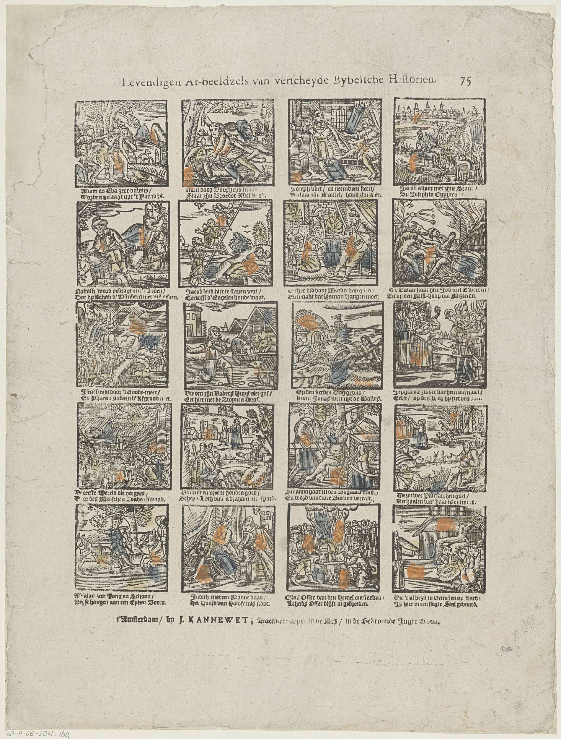 Blad met 20 voorstellingen van verhalen uit het Oude Testament, waaronder Adam en Eva die worden verdreven uit het paradijs en Jona die op het droge wordt geworpen. Onder elke afbeelding een tweeregelig vers. Genummerd rechtsboven: 75.
