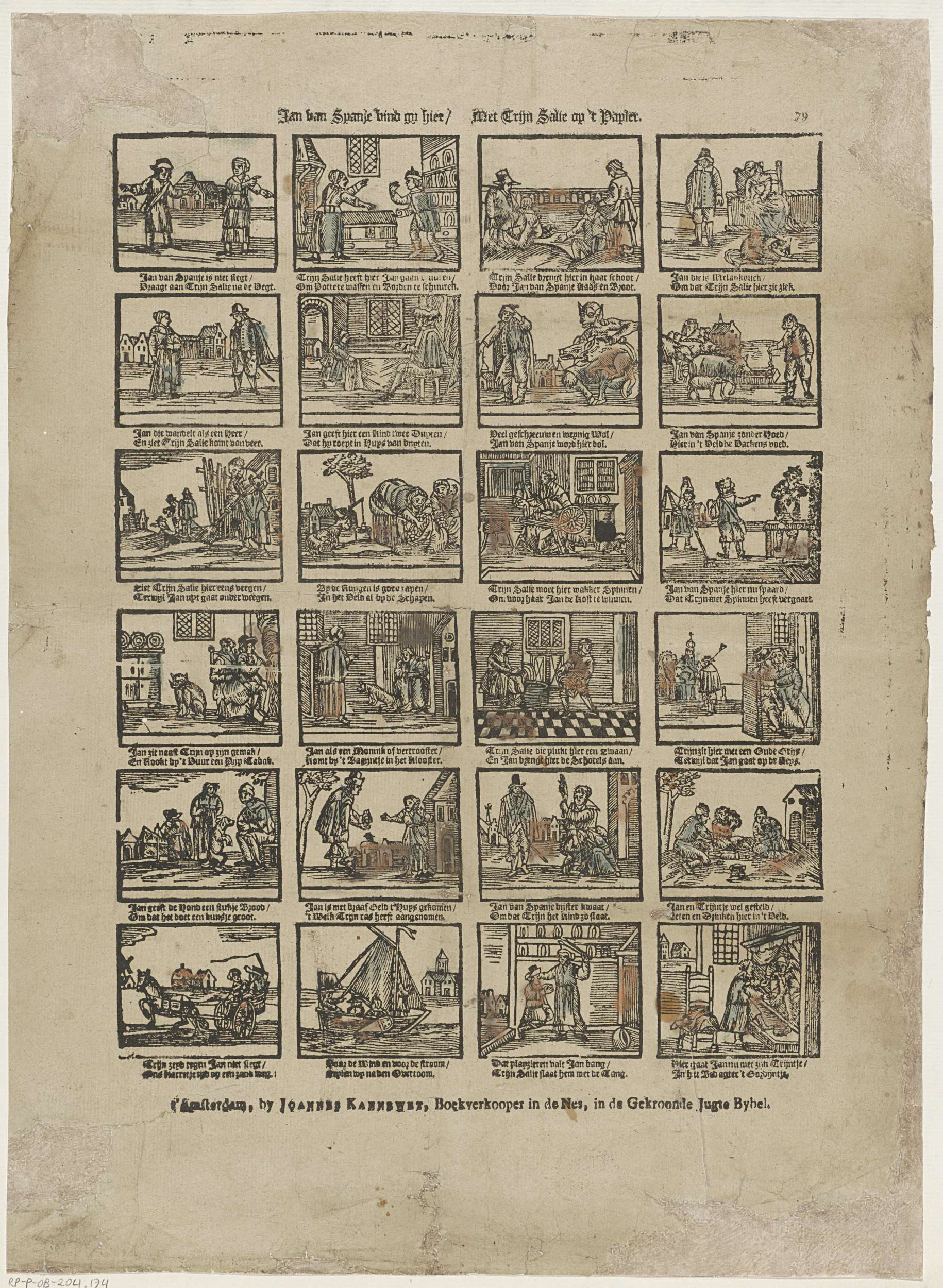 Blad met 24 voorstellingen over het leven van Jan van Spanje en Trijn Salie. Onder elke afbeelding een tweeregelig vers. Genummerd rechtsboven: 79.