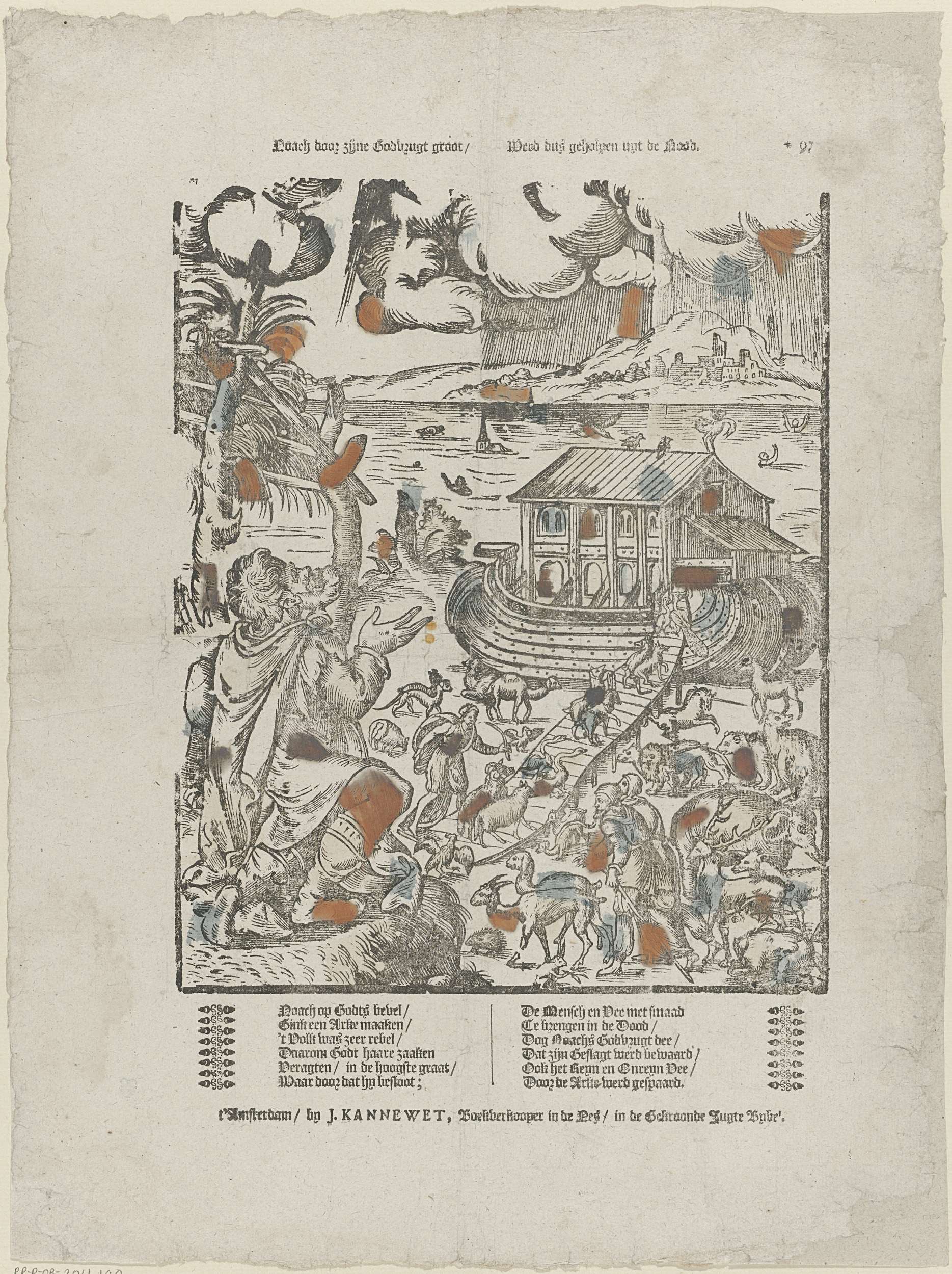 De ark van Noach. Op de achtergrond stormt het hevig en stijgt het water. Mensen en dieren verdrinken. Op de voorgrond gaan paren van verschillende diersoorten aan boord van Noachs ark. Onder de afbeelding een twaalfregelig vers in twee kolommen. Genummerd rechtsboven: *97.