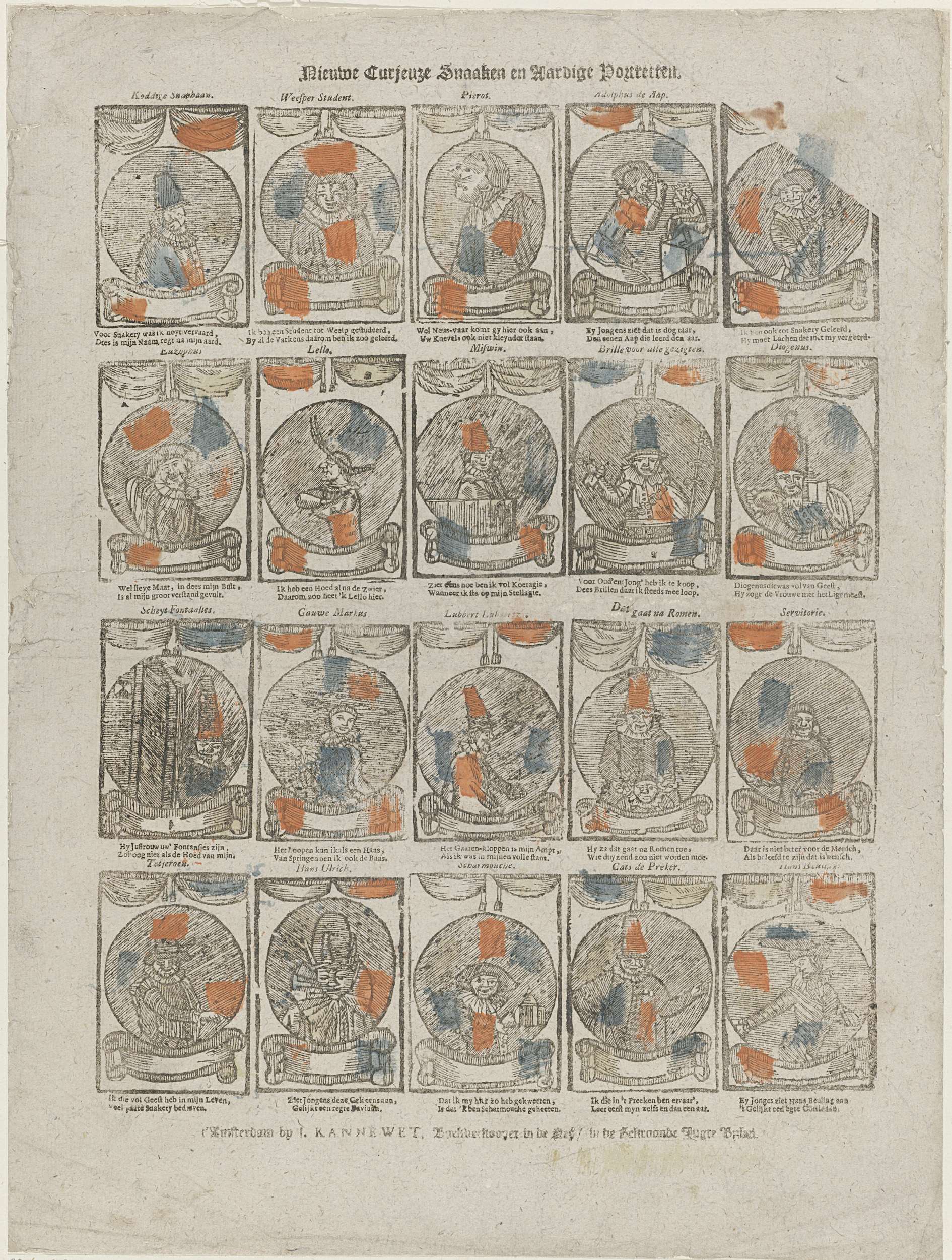 Blad met 20 medaillons met portretten van populaire figuren, onder wie Tetjeroen, Aesopus en Hans Ulrich. Onder elke afbeelding een tweeregelig vers, boven elke afbeelding de naam van de geportretteerde.