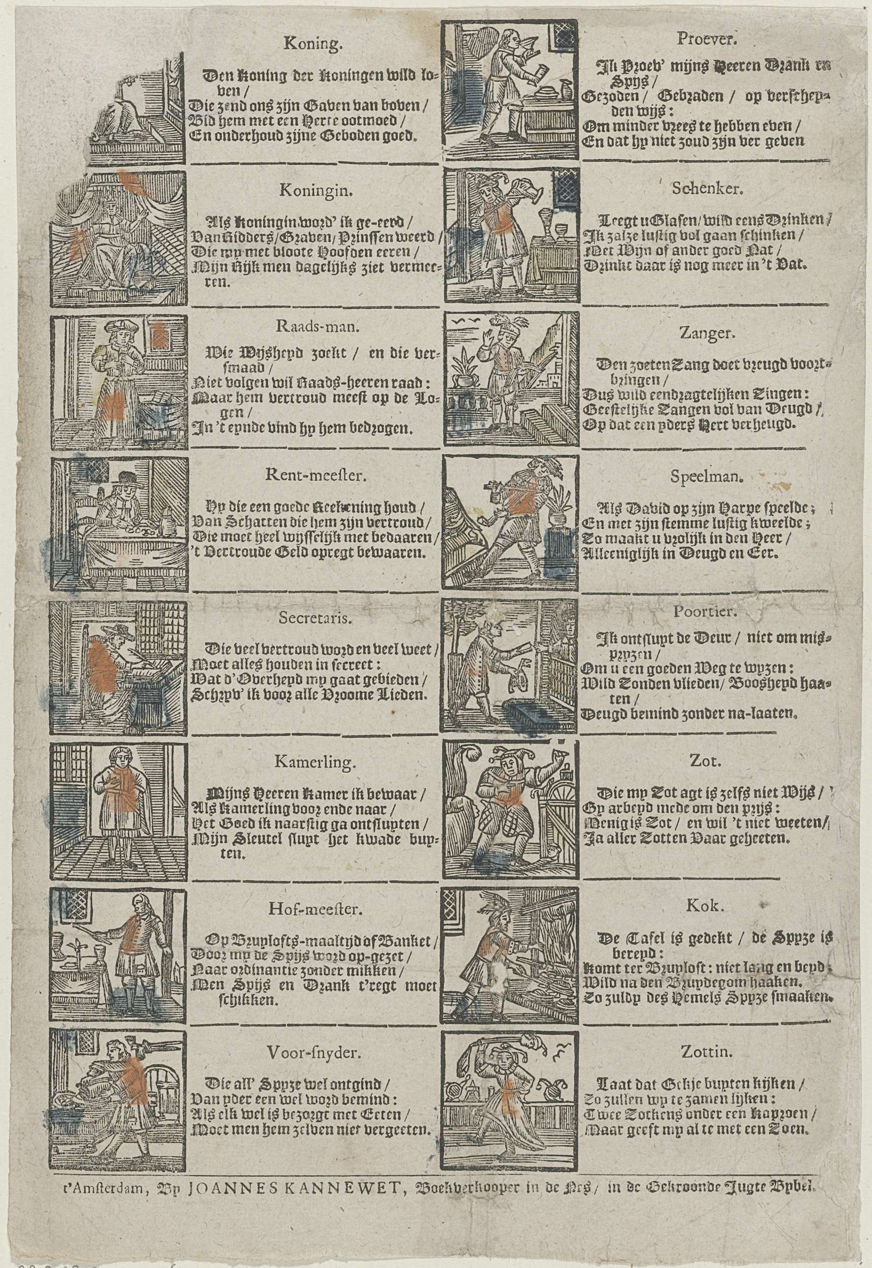 Blad met 16 voorstellingen (driekoningenbriefjes) van verschillende functies binnen het hof, waaronder een raadsman, een proever en een portier. Rechts naast elke afbeelding een bijschrift.
