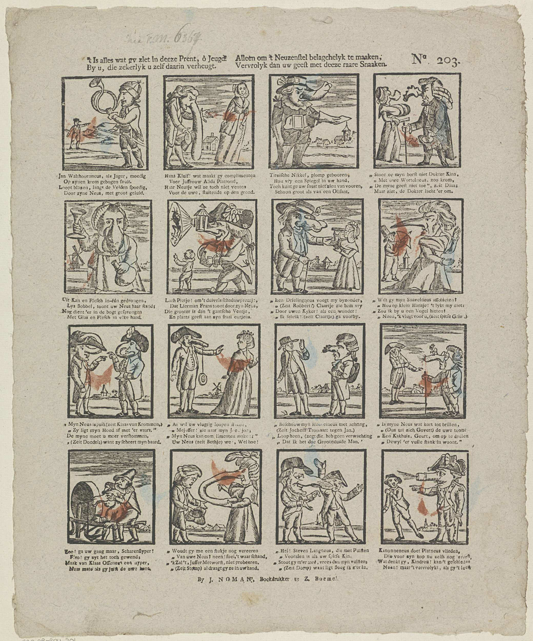 Blad met 16 komische voorstellingen van figuren met grote en misvormde neuzen. Onder elke afbeelding een vierregelig vers. Genummerd rechtsboven: No. 203.