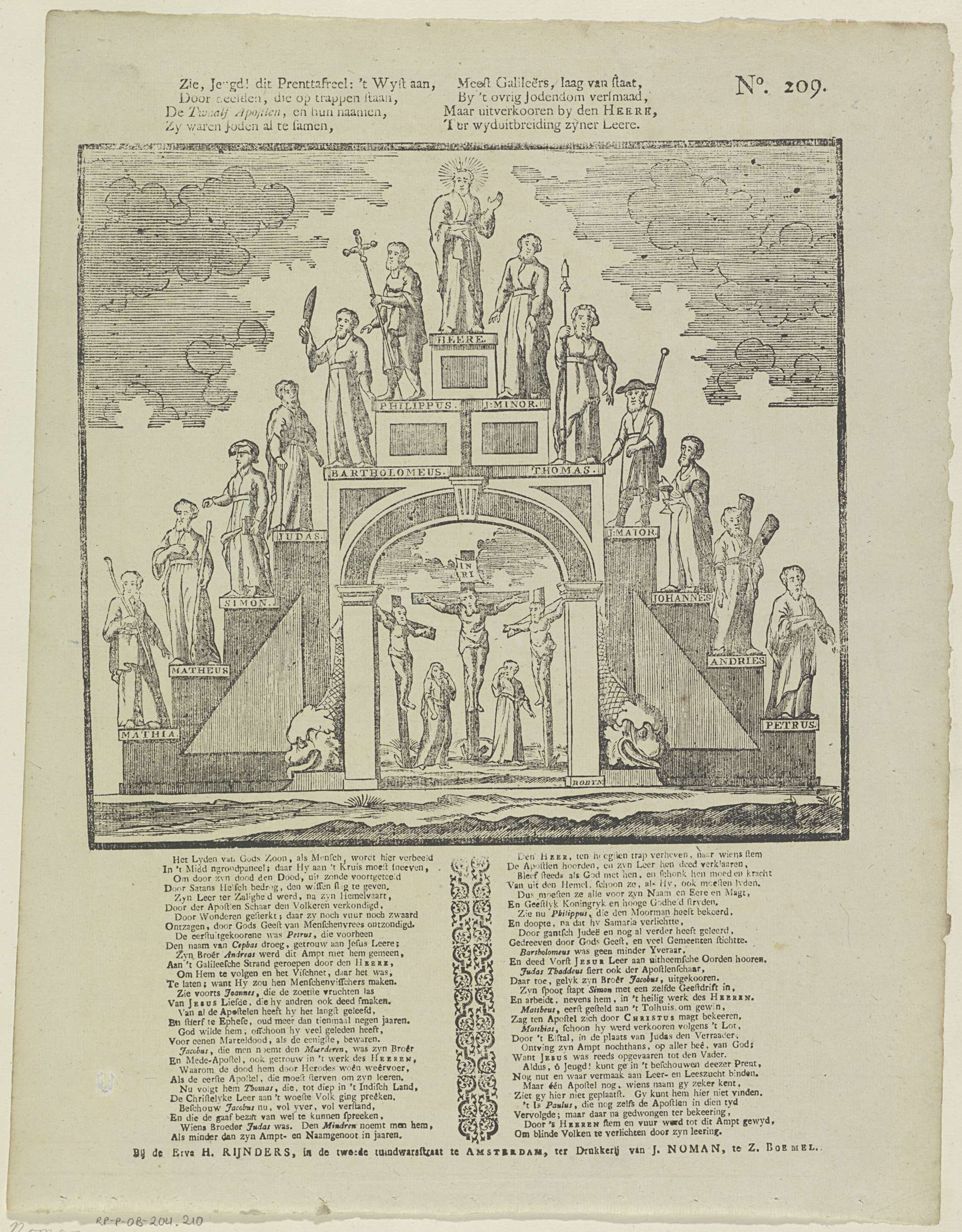 Blad met een grote voorstelling van een trap met dertien treden. Op de treden staan Christus en de apostelen. In de boog onder de trap Christus aan het kruis, met Maria en Johannes. Onder de afbeelding een vers in twee kolommen. Genummerd rechtsboven: No. 209.
