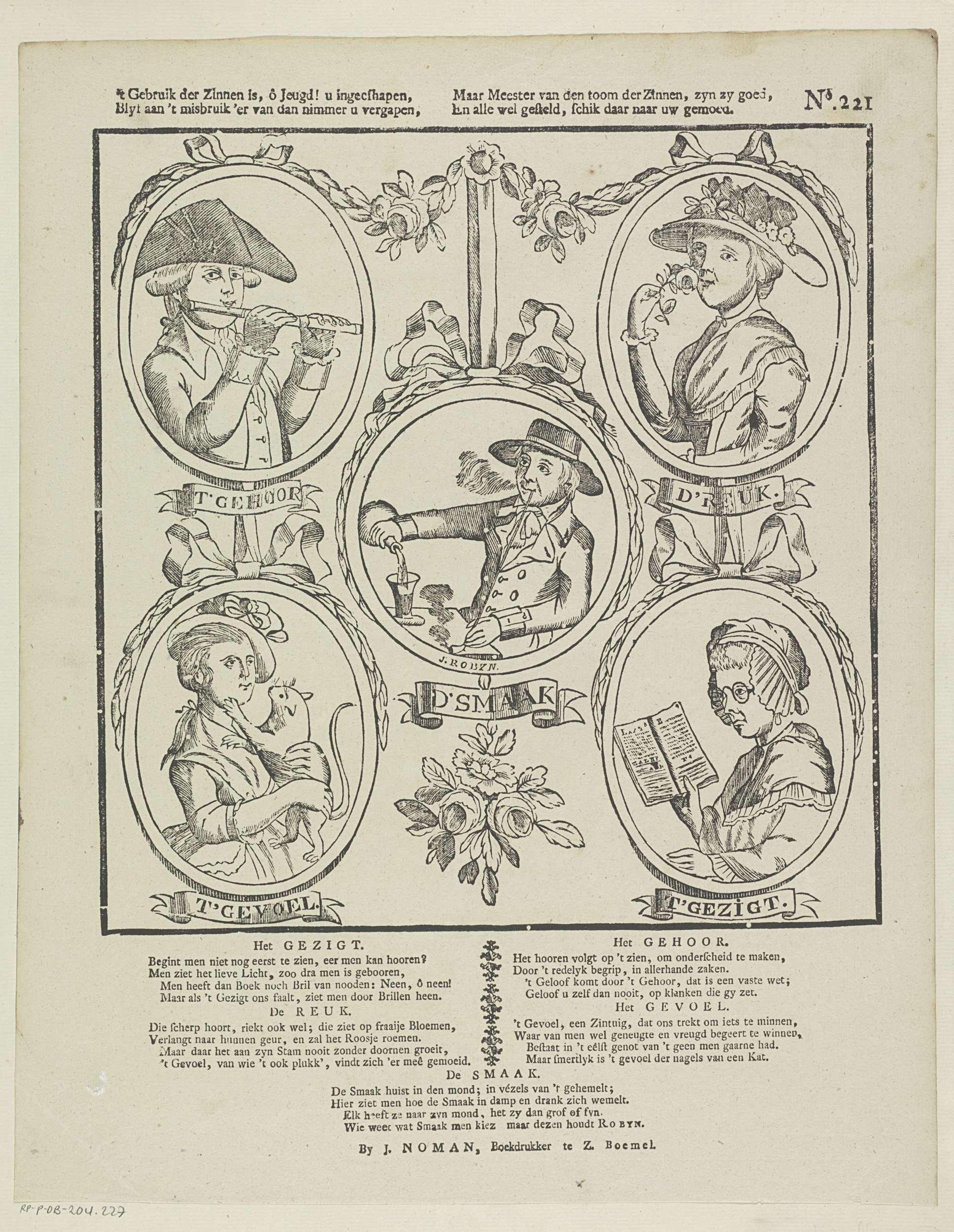 De vijf zintuigen verbeeld door mannen en vrouwen in vijf medaillons, aan elkaar verbonden met linten en bloemenranken. Het geheel is gevat in een kader. Onder de afbeelding vijf korte versjes. Genummerd rechtsboven: No. 221.
