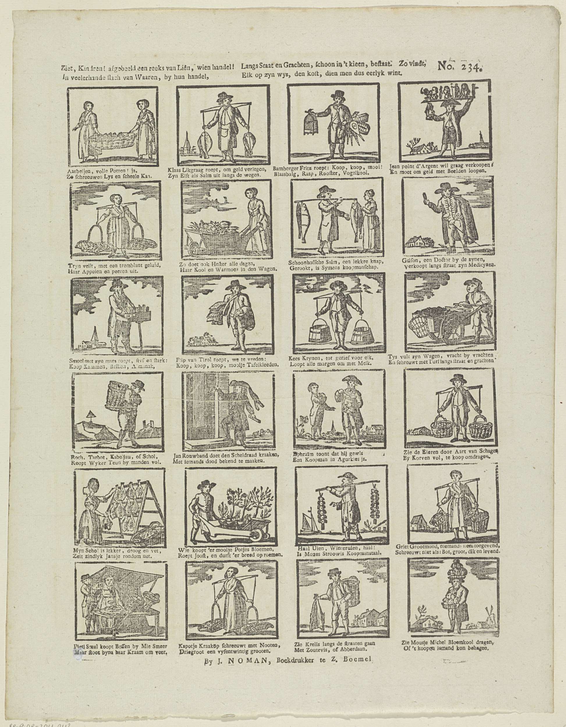 Blad met 24 voorstellingen van straatverkopers, zoals een visverkoper, een beeldenverkoper en een notenverkoopster. Onder elke afbeelding een tweeregelig vers. Genummerd rechtsboven: No. 234.