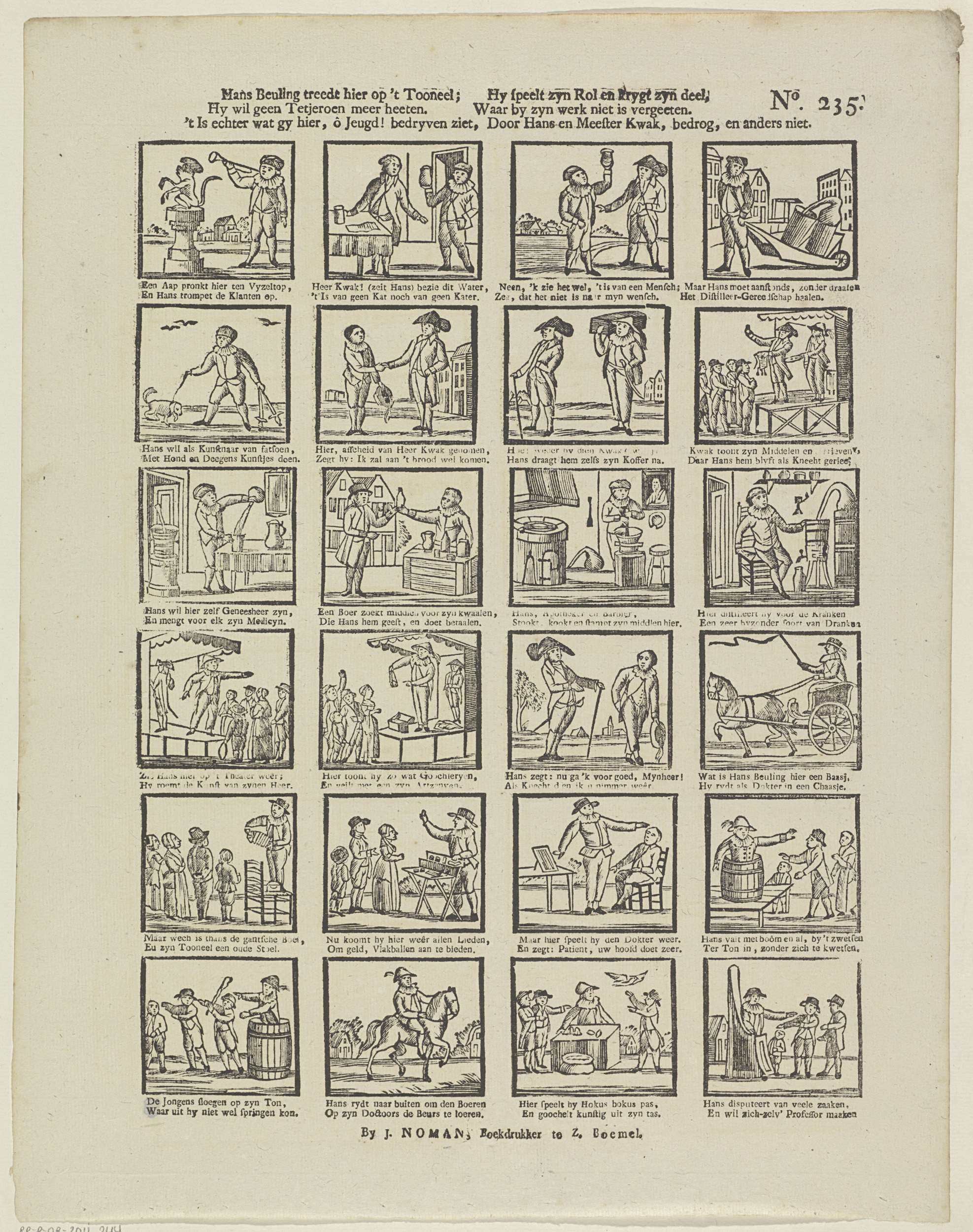 Blad met 24 voorstellingen over het leven van de kwakzalver en grappenmaker Hans Beuling. Onder elke afbeelding een tweeregelig vers. Genummerd rechtsboven: No. 235.