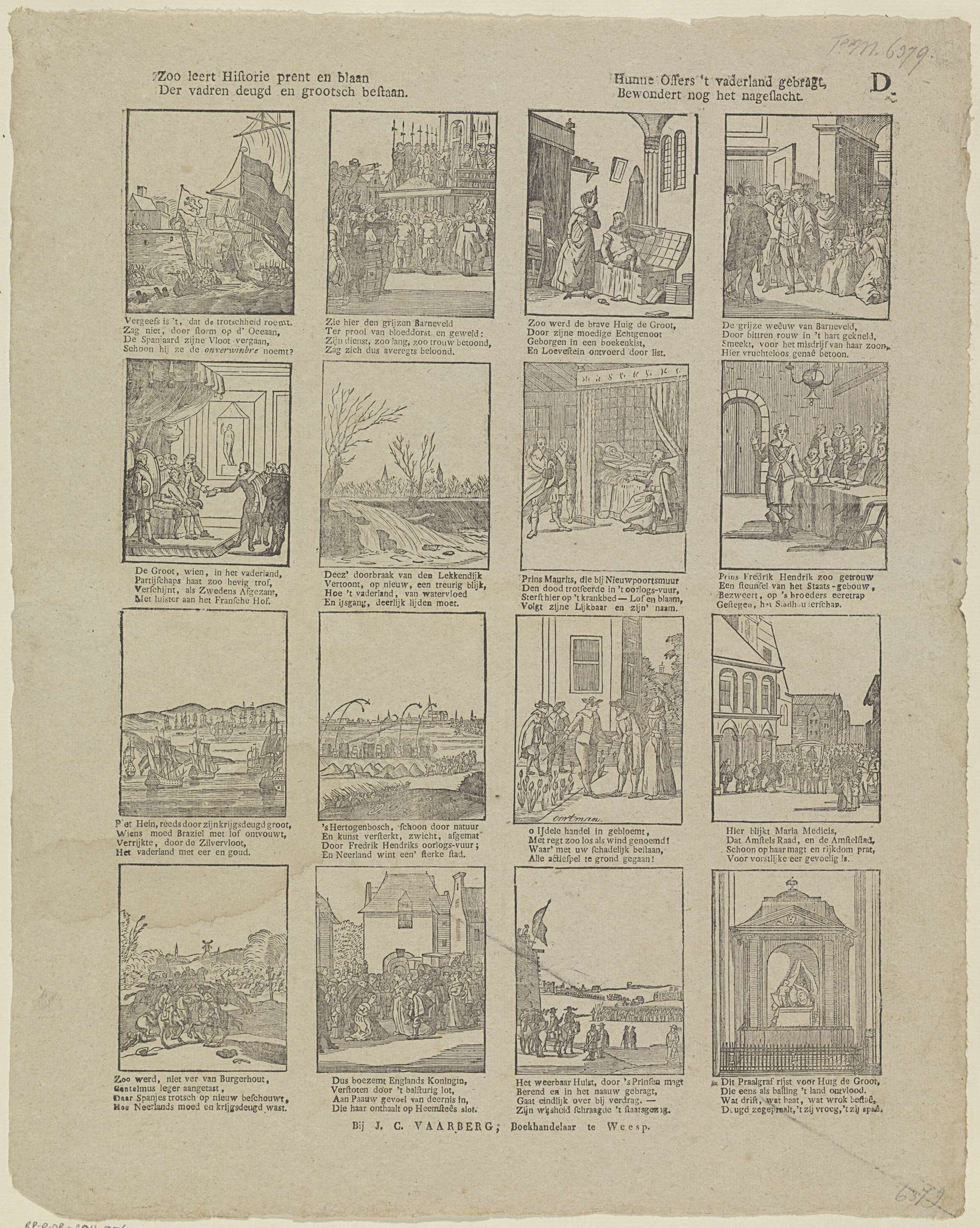 Blad met 16 voorstellingen van gebeurtenissen uit de vaderlandse geschiedenis, zoals Hugo de Groot die ontsnapt uit Slot Loevestein in een boekenkist en de dood van Maurits. Onder elke afbeelding een vierregelig vers. Gemerkt rechtsboven: D.