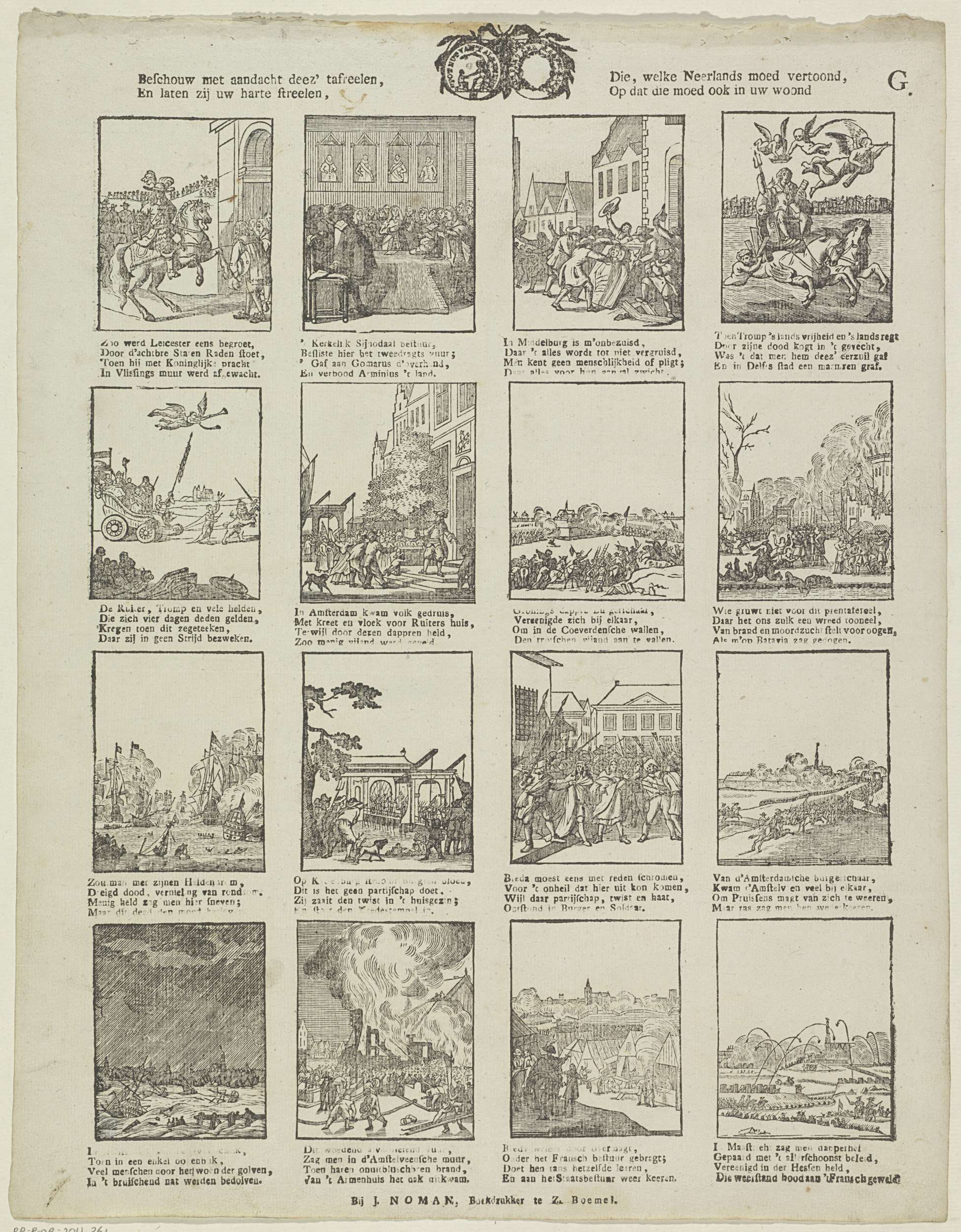Blad met 16 voorstellingen van gebeurtenissen uit de vaderlandse geschiedenis, zoals het ontzet van Coevorden in 1594 en het ontzet en de inname van Breda in 1637. Onder elke afbeelding een vierregelig vers. Midden boven het zegel van de Maatschappij tot Nut van 't Algemeen. Gemerkt rechtsboven: G.