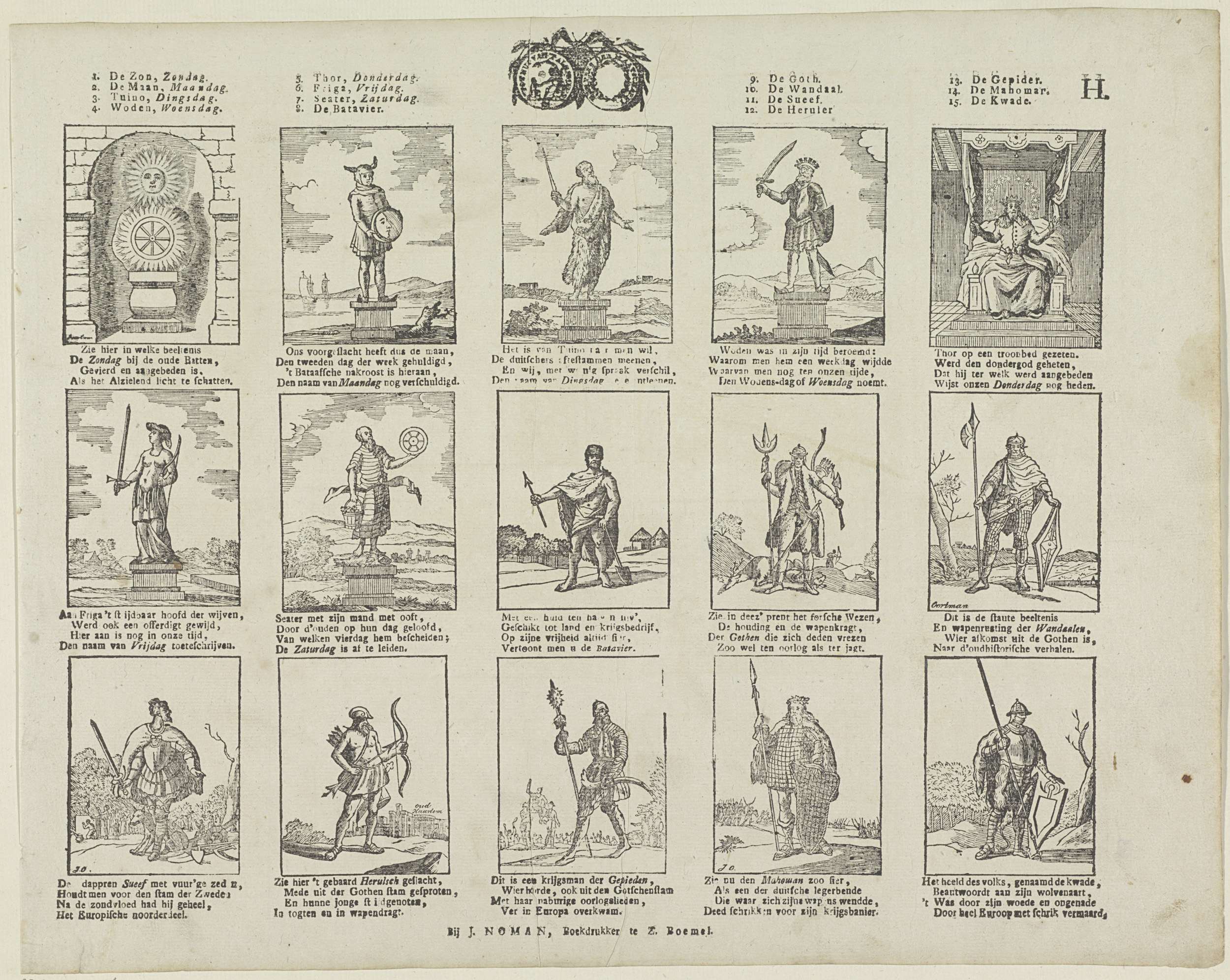 Blad met 15 voorstellingen van mythologische figuren, personificaties van de zeven dagen van de week en verschillende volksstammen, zoals de Batavieren en de Goten. Onder elke afbeelding een vierregelig vers. Boven een verklarende lijst met nummers. Midden boven het zegel van de Maatschappij tot Nut van 't Algemeen. Gemerkt rechtsboven: H.