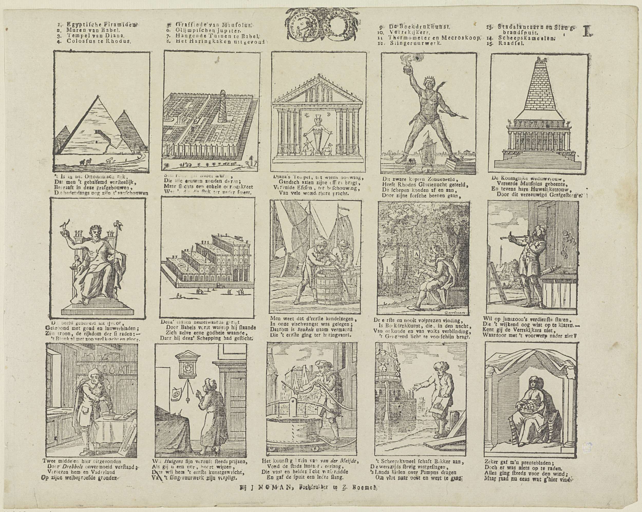 Blad met 15 voorstellingen van de zeven wereldwonderen en voorstellingen van belangrijke uitvindingen, zoals de boekdrukkunst en de verrekijker. Onder elke afbeelding een vierregelig vers. Boven een verklarende lijst met nummers. Gemerkt rechtsboven: I.