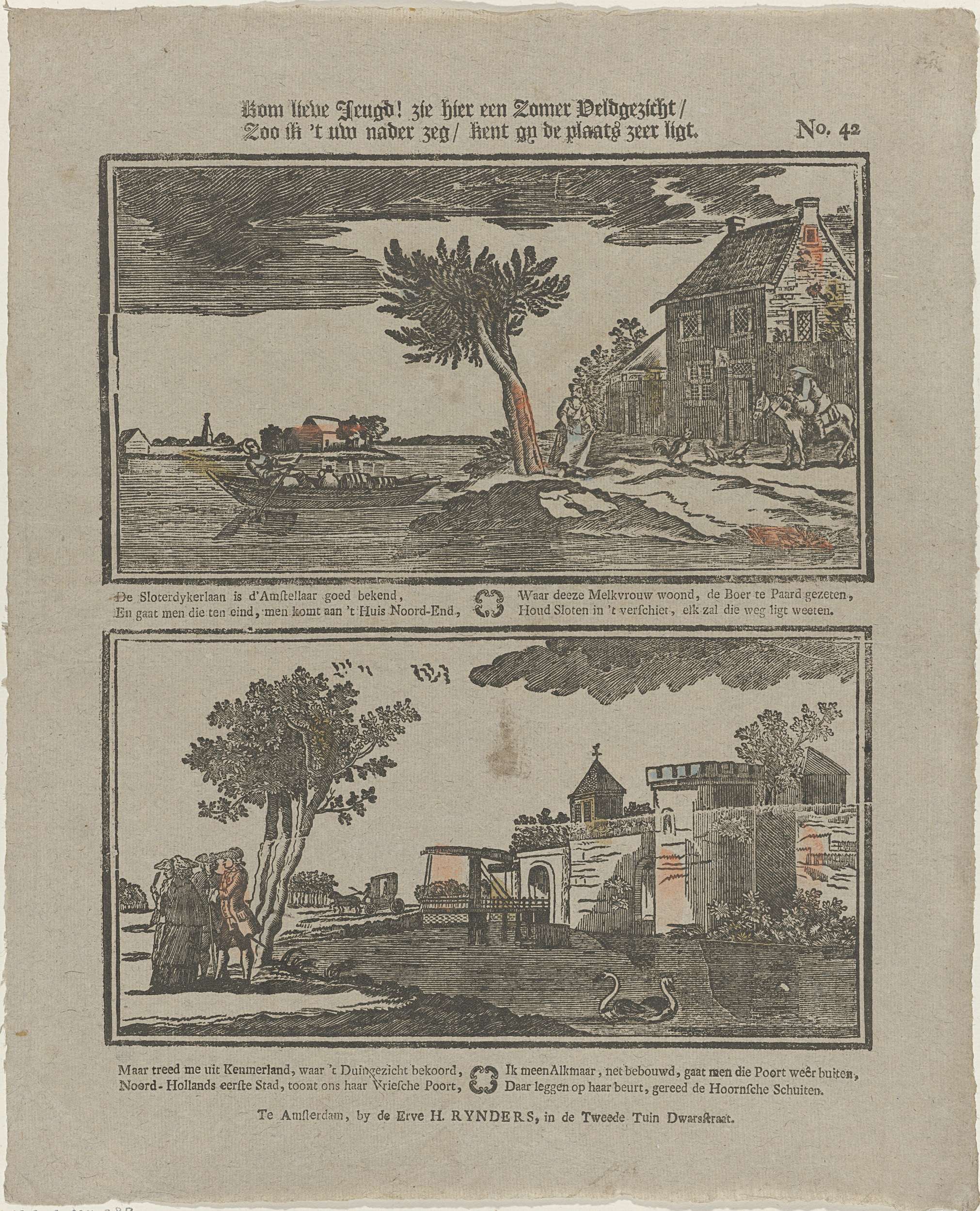Blad met 2 voorstellingen van landschappen in de omgeving van Amsterdam en Alkmaar. Onder elke afbeelding een vierregelig onderschrift in twee kolommen. Genummerd rechtsboven: No. 42.