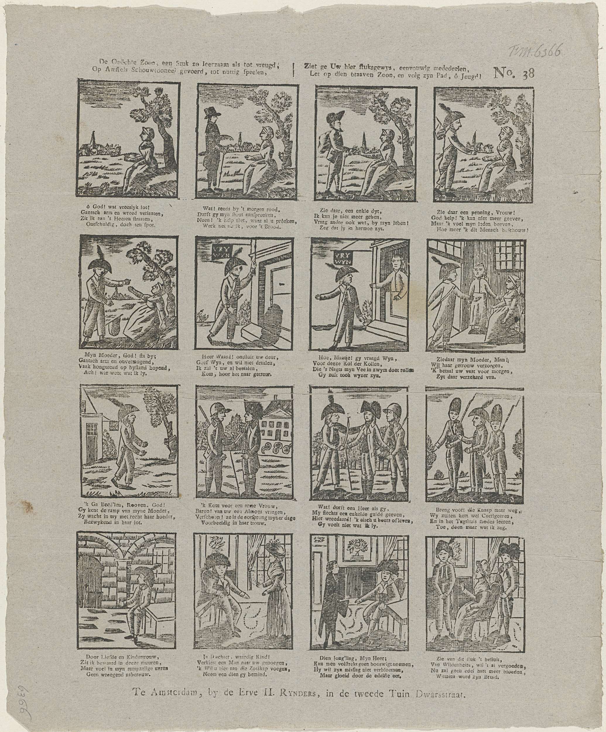 Blad met 16 voorstellingen over een jongeman die bedelt en trouwt met de rijke Wilmina. Onder elke afbeelding een vierregelig vers. Genummerd rechtsboven: No. 38.