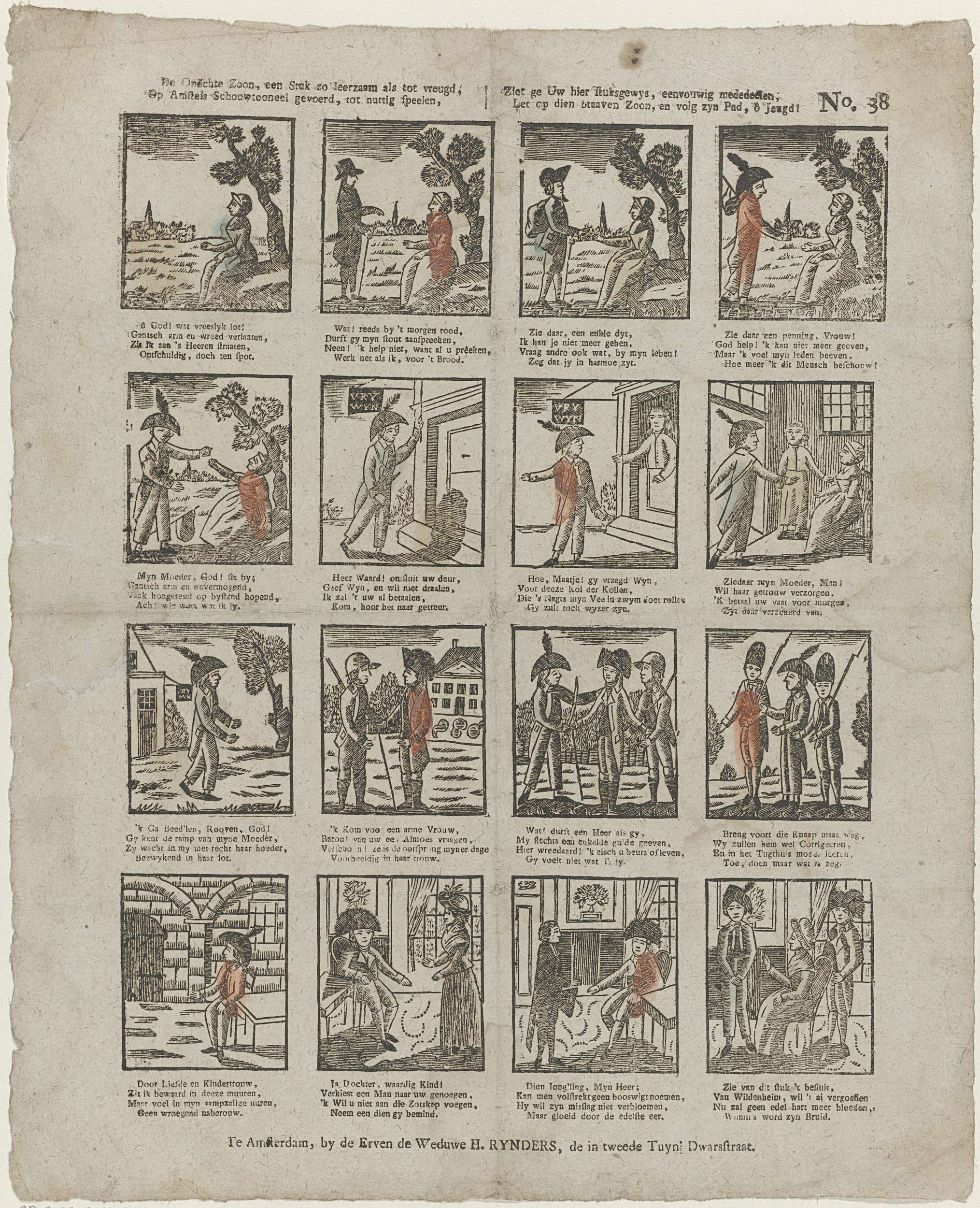 Blad met 16 voorstellingen over een jongeman die bedelt en trouwt met de rijke Wilmina. Onder elke afbeelding een vierregelig vers. Genummerd rechtsboven: No. 38.