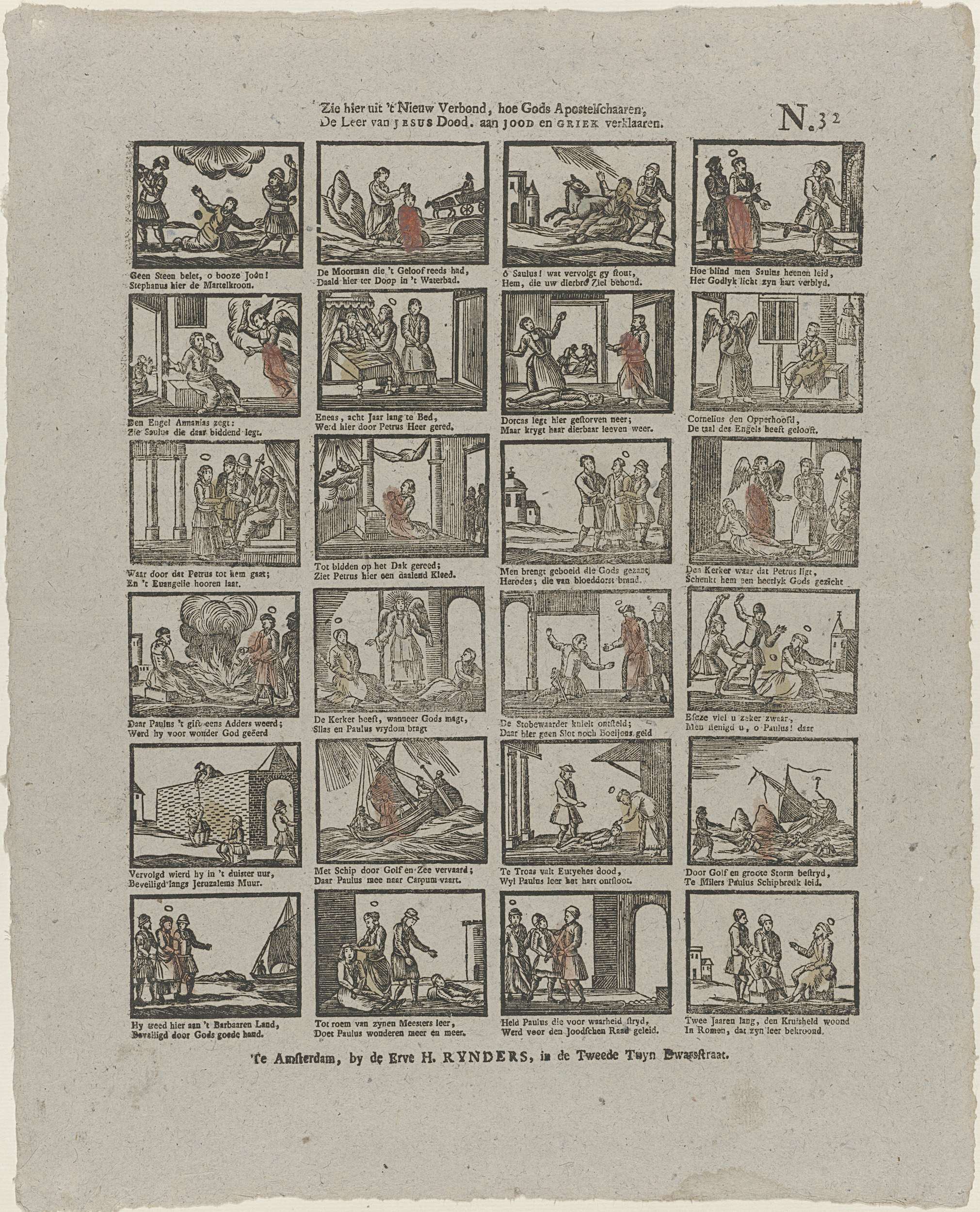 Blad met 24 voorstellingen over de bekering en het leven van de apostelen. Onder elke voorstelling een tweeregelig vers. Genummerd rechtsboven: N. 32.