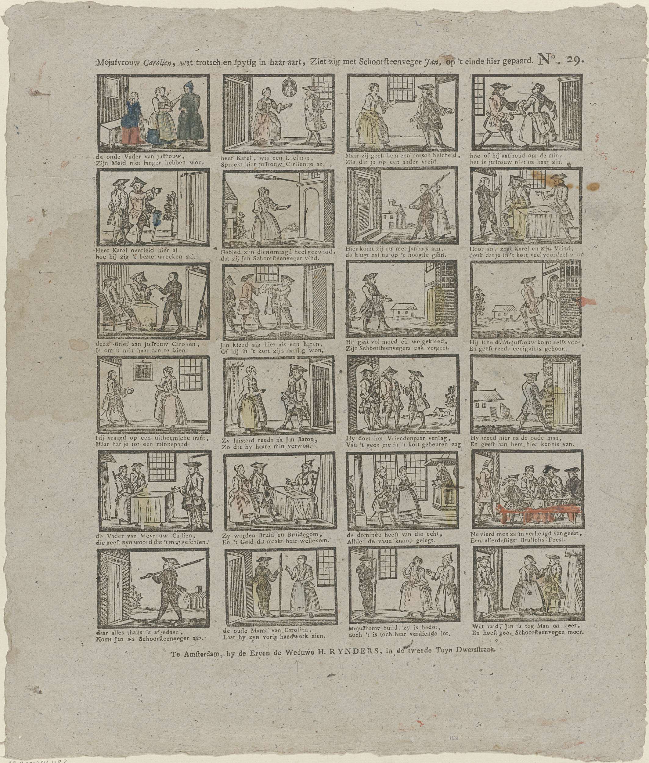 Blad met 24 voorstellingen uit het verhaal van Carolien en schoorsteenveger Jan. Twee afgewezen minnaars van de hoogmoedige Carolien sturen haar een schoorsteenveger die zij rijk hebben uitgedost en goed van geld voorzien. Carolien wordt verliefd en trouwt de vermeende edelman, die daags na het huwelijk zich voordoet voor wat hij werkelijk is. Onder elke ...