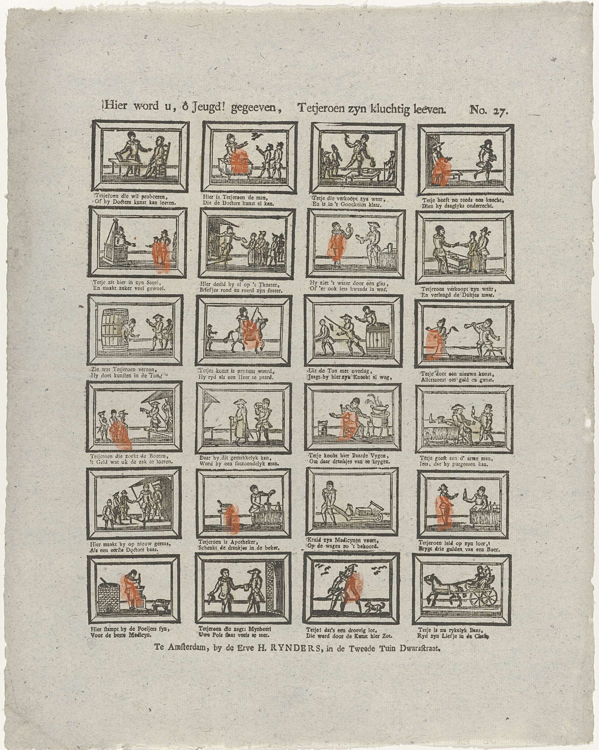 Blad met 24 voorstellingen over het leven van de kwakzalver en grappenmaker Tetjeroen. Hij gaat in de leer bij een dokter, klopt boeren geld uit de zak, kookt drankjes van paardenvijgen en gaat met zijn liefje in een koets rijden. Onder elke afbeelding een tweeregelig vers. Genummerd rechtsboven: No. 27.