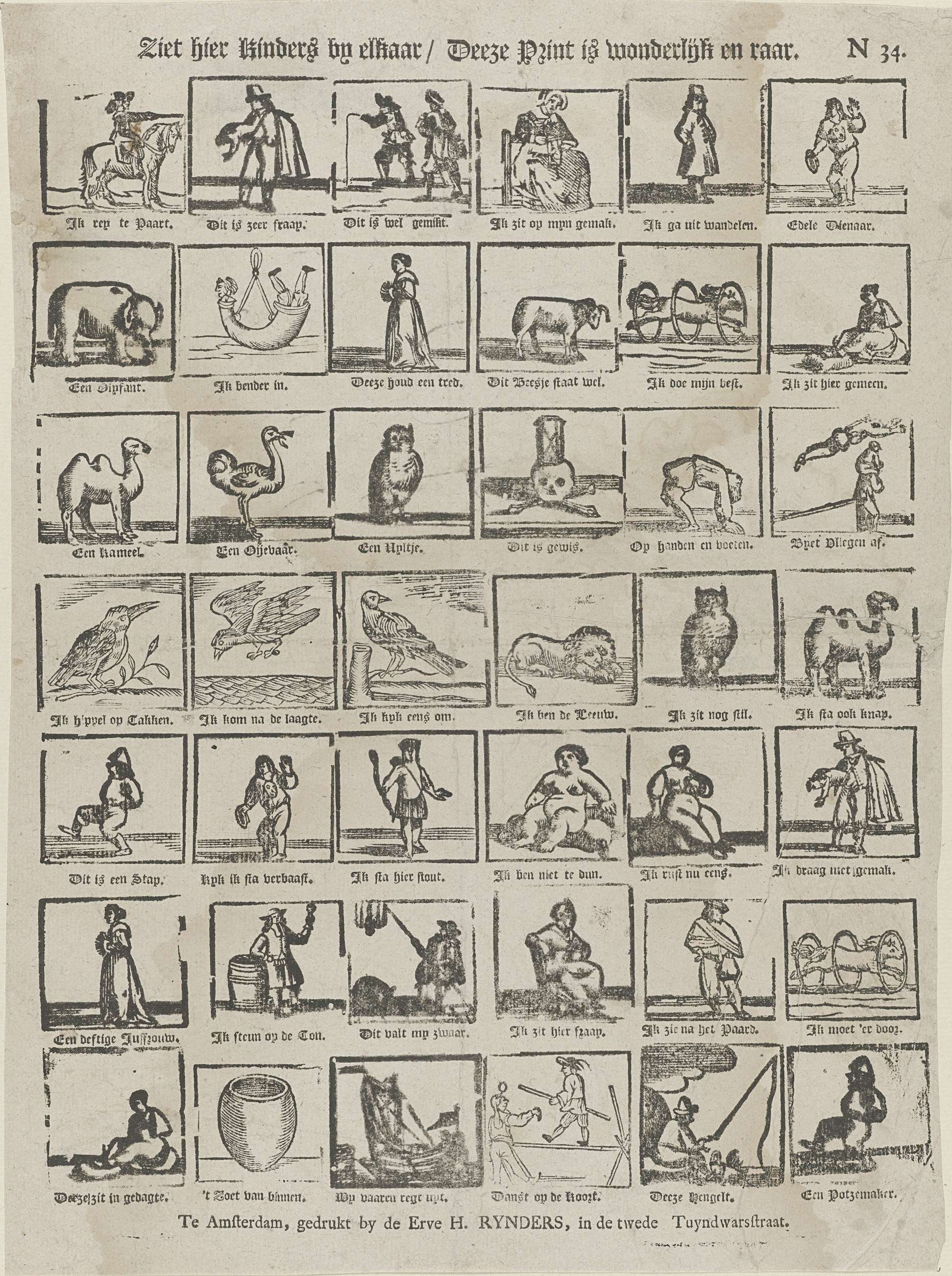 Blad met 24 voorstellingen van figuren, dieren, bezigheden en voorwerpen. Onder elke afbeelding een onderschrift. Genummerd rechtsboven: No. 34.