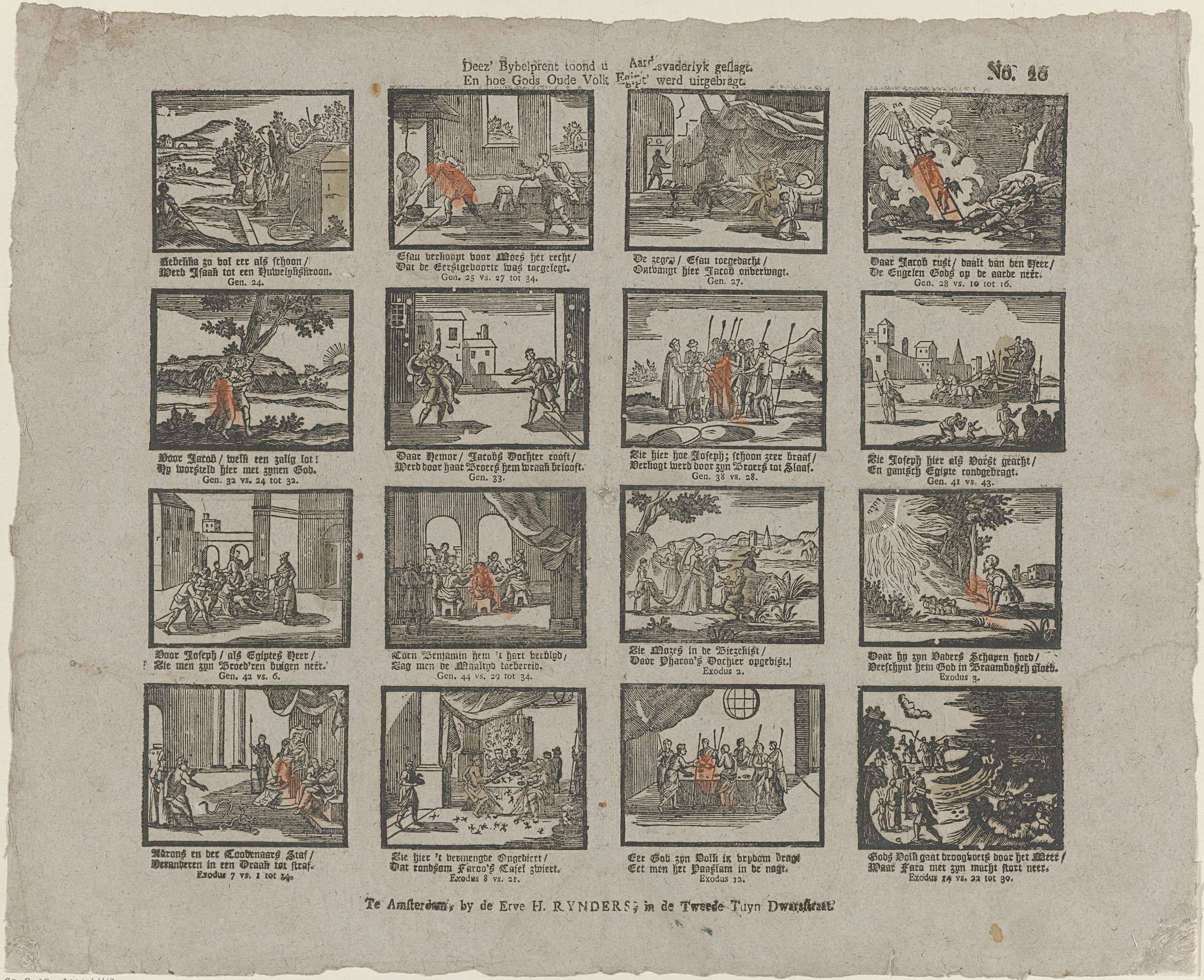 Blad met 16 voorstellingen van verhalen uit het Oude Testament, waaronder Jakobs droom, Mozes die wordt gevonden en de doortocht door de Rode zee. Onder elke voorstelling een tweeregelig vers en een verwijzing naar de bijbehorende Bijbeltekst. Genummerd rechtsboven: No. 20.