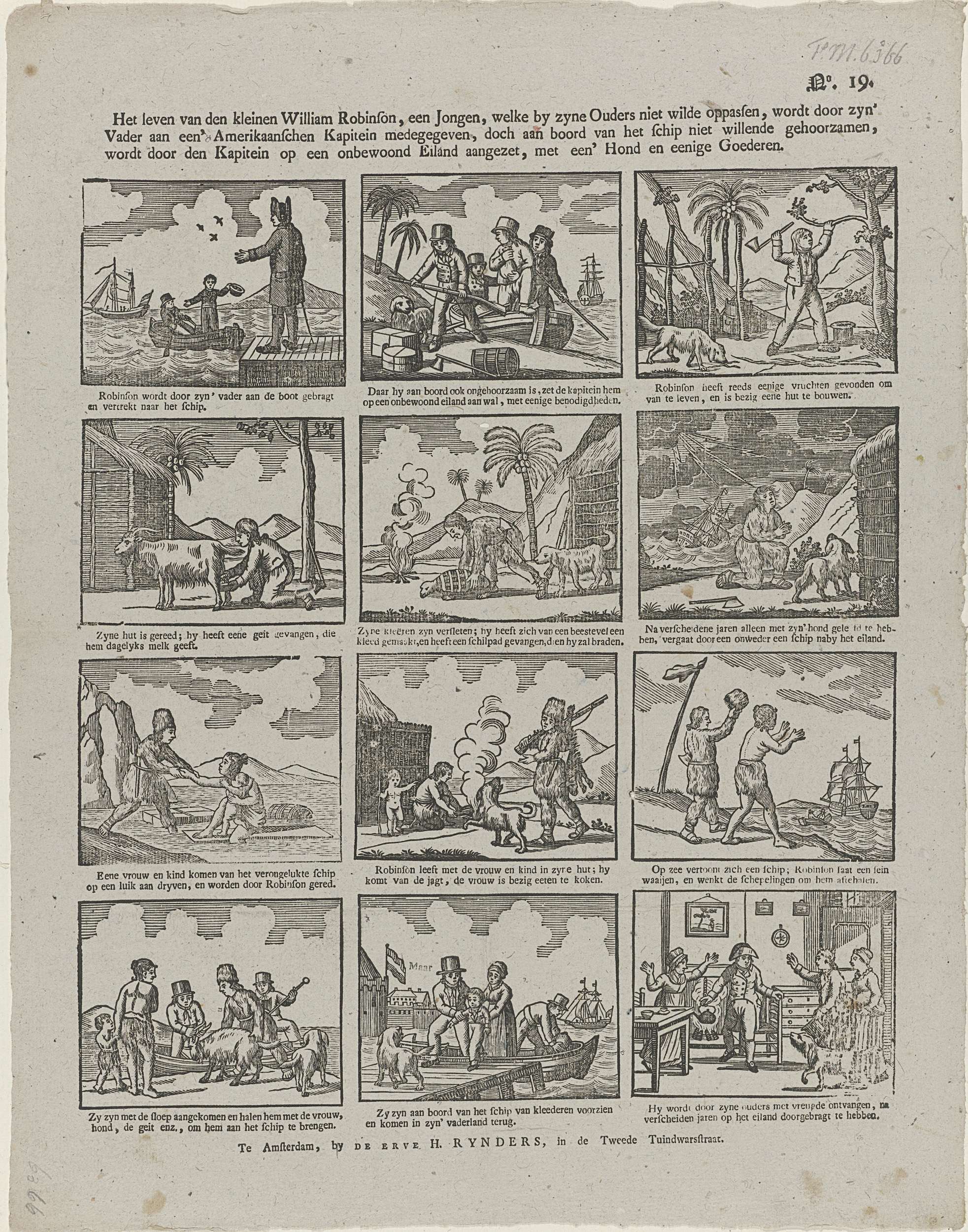 Blad met 12 voorstellingen over William Robinson die op een onbewoond eiland wordt achtergelaten. Onder elke afbeelding een onderschrift. Genummerd rechtsboven: No. 19.