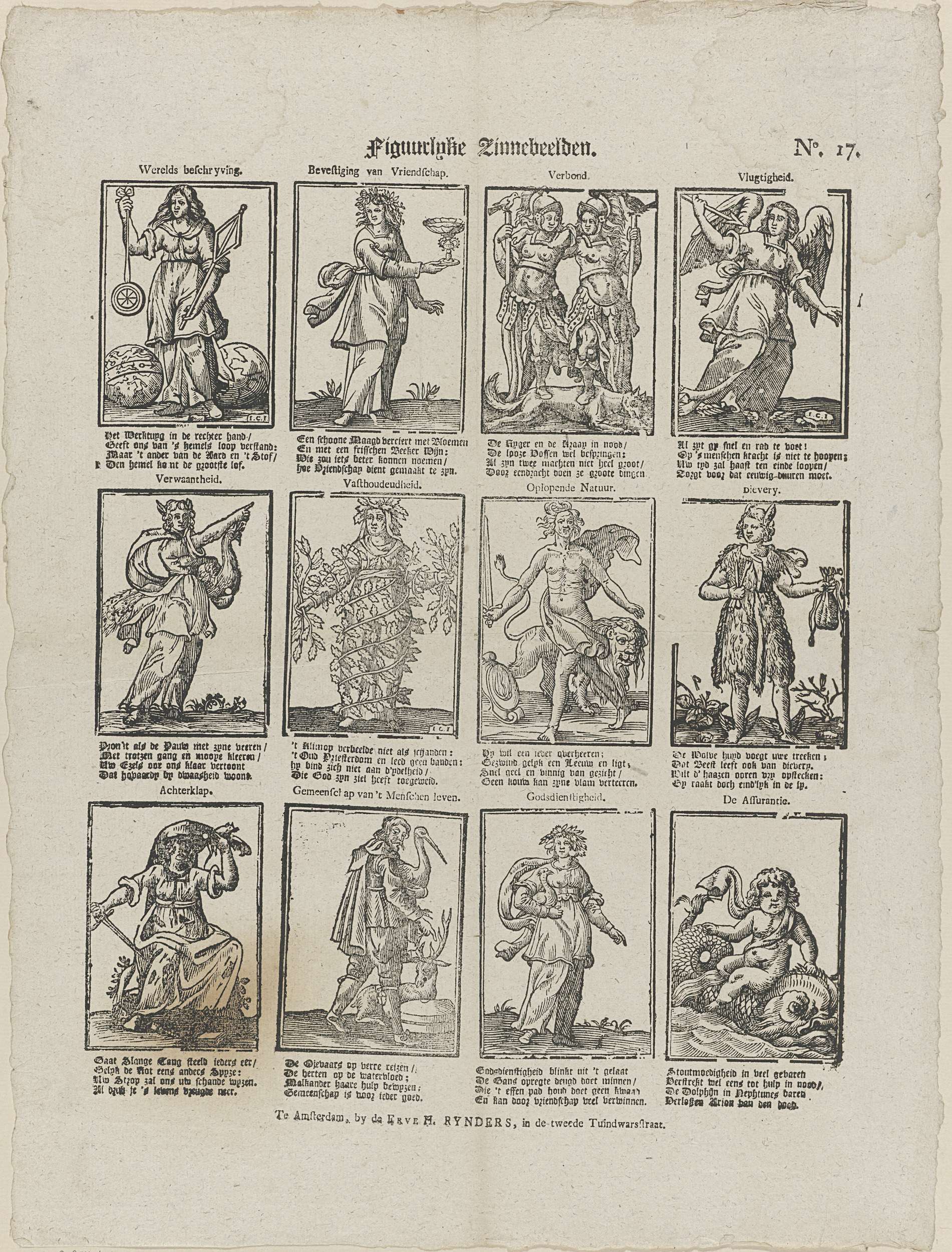 Blad met 12 voorstellingen van allegorische figuren. Onder elke voorstelling een vierregelig vers, boven elke afbeelding een titel. Genummerd rechtsboven: No. 17.