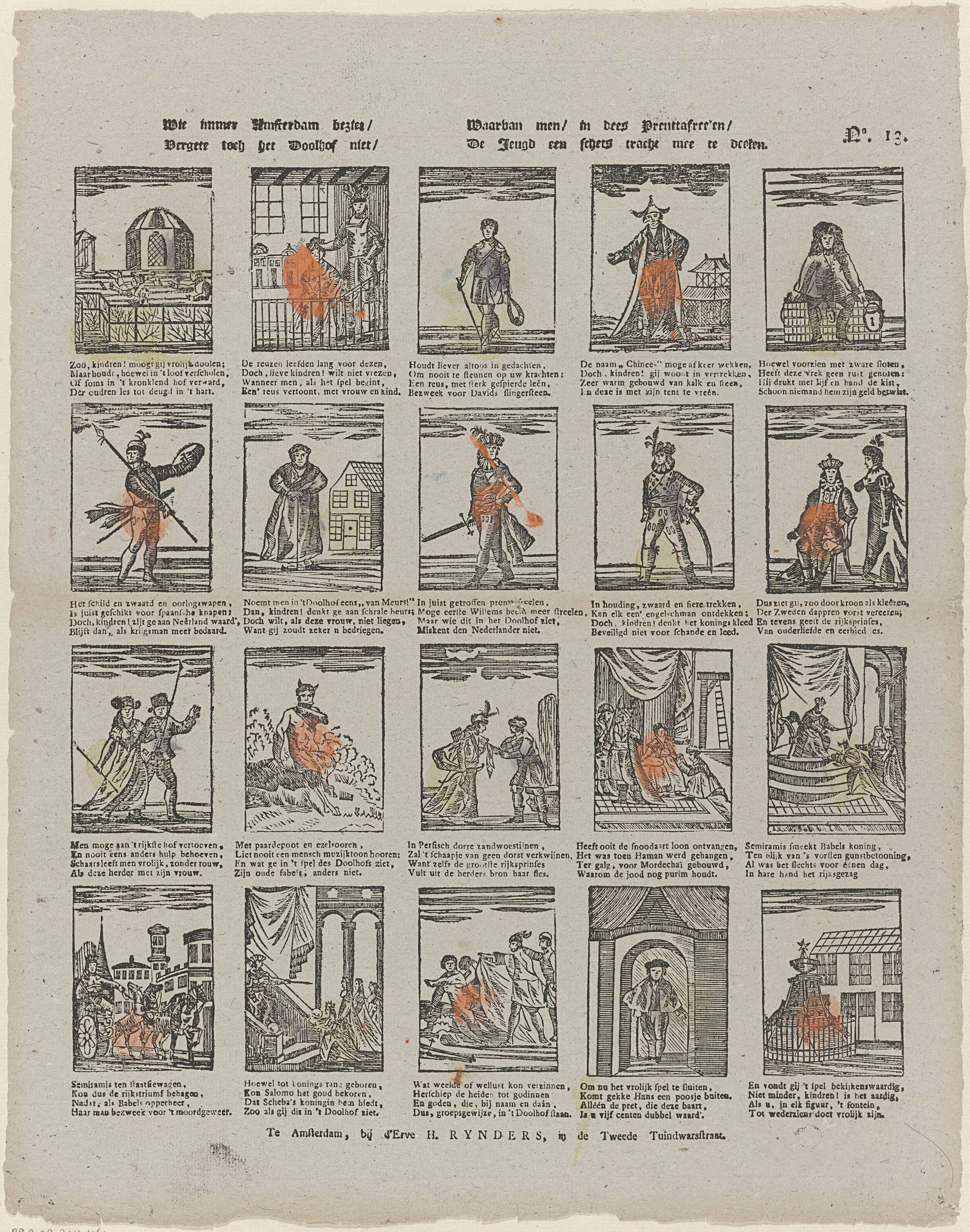 Blad met 20 voorstellingen van de Amsterdamse 'Oude Doolhof' op de Prinsengracht, en verschillende figuren zoals een Chinees, een herder en een herderin. Onder elke afbeelding een vierregelig vers. Genummerd rechtsboven: No. 13.